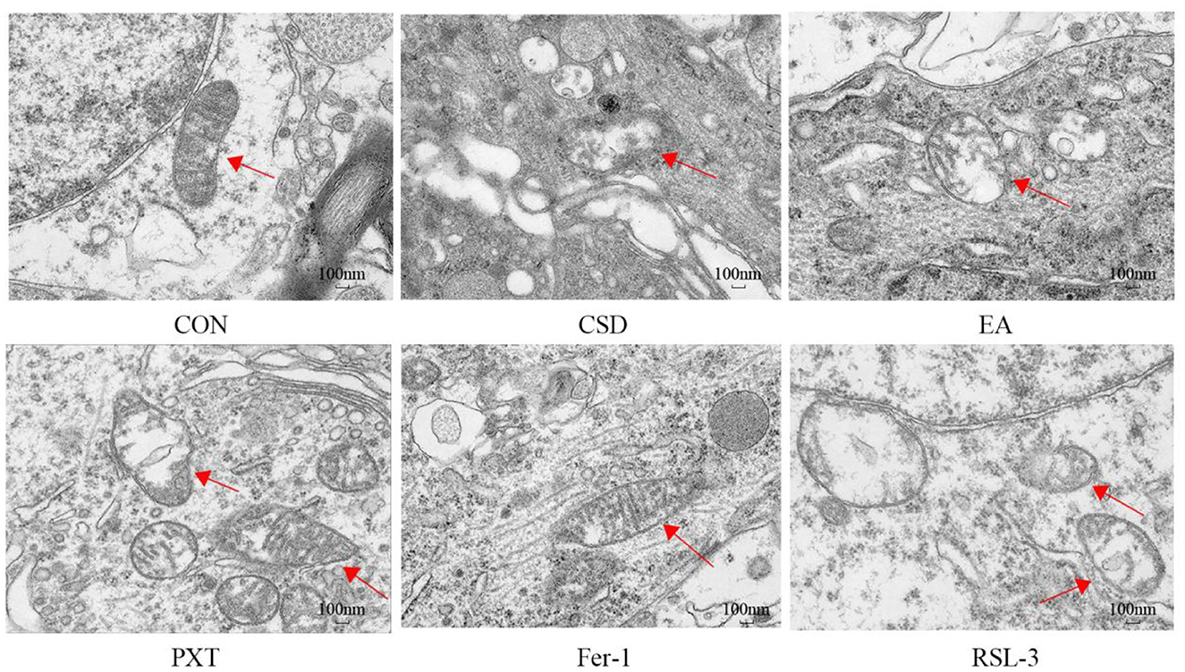 The CON group had a normal number of mitochondria in the hippocampal neurons, with intact double membranes, normal mitochondrial crista morphology, and clear outlines. In contrast to the CON group, the CSD group showcased hippocampal neurons with mitochondria that were torn, bloated, and misshapen, featuring a thicker membrane, hazy edges, and several breaches. The mitochondrial cristae were notably diminished or completely vanished. Compared to the CSD group, the mitochondrial morphology in hippocampal neurons of the EA, PXT, and Fer-1 groups was relatively normal, with more intact double membranes and clearer mitochondrial cristae. Compared to the CSD group, the slight reduction in mitochondrial cristae of the EA, PXT, and Fer-1 groups was observed, and autophagic bodies were visible. The RSL-3 group had a small number of mitochondria with relatively intact structures, clear boundaries, and a normal membrane density. However, the RSL-3 group showed partial loss of mitochondrial cristae and blurred membrane demarcation (as shown in Figure 7).