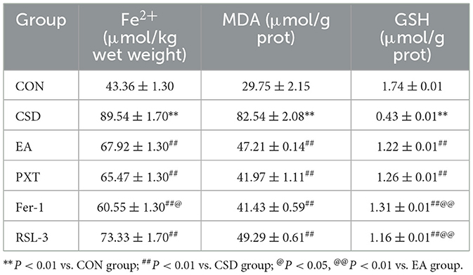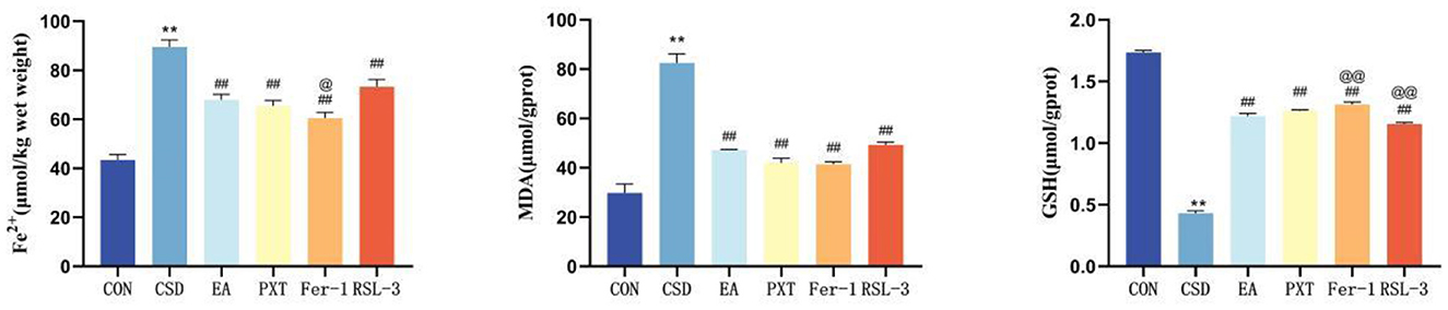 Compared to the CON group, the CSD group exhibited significantly increased levels of Fe2+ and MDA in hippocampal tissue (P < 0.01), and significantly decreased levels of GSH (P < 0.01). Compared to the CSD group, the EA, PXT, Fer-1, and RSL-3 groups had significantly decreased levels of Fe2+ and MDA in the hippocampus (P < 0.01), and significantly increased levels of GSH (P < 0.01).