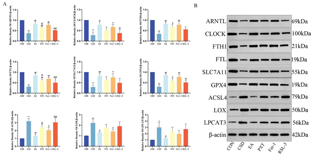 Compared with the CON group, the levels of ARNTL, CLOCK, FTH1, FTL, SLC7A11, and GPX4 in the hippocampus of CSD rats were significantly decreased (P < 0.01), while the levels of ACSL4, LOX, and LPCAT3 were significantly increased (P < 0.01, P < 0.05). Compared with the CSD group, the EA, PXT, Fer-1, and RSL-3 groups had significantly increased levels of ARNTL, CLOCK, FTH1, FTL, SLC7A11, and GPX4 (P < 0.01, P < 0.05), and significantly decreased expression of ACSL4, LOX, and LPCAT3 (P < 0.01, P < 0.05). Compared with the EA group, ARNTL and FTL levels were significantly decreased in the PXT and RSL-3 groups (P < 0.01, P < 0.05, respectively), CLOCK and GPX4 levels were significantly decreased in the RSL-3 group (P < 0.05), and ACSL4 levels were significantly increased in both the PXT and RSL-3 groups (P < 0.01, P < 0.05, respectively). Other contrasts showed no statistical importance (as shown in Figure 9).