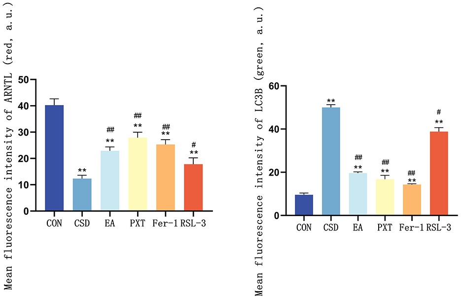 In the CON group, ARNTL (red) fluorescence was strong, while LC3 (green) fluorescence was weak, indicating high ARNTL expression and low autophagic activity. In contrast, the CSD group showed reduced ARNTL and increased LC3 fluorescence, suggesting circadian rhythm suppression and autophagy overactivation. Compared with CSD, the EA, PXT, Fer-1, and RSL-3 groups exhibited partial recovery of ARNTL and reduced LC3 signals, indicating restoration of rhythm–autophagy balance (as shown in Figure 10). Quantitatively, ARNTL fluorescence intensity was significantly decreased and LC3 increased in the CSD, EA, PXT, Fer-1, and RSL-3 groups vs. CON (P < 0.01). Relative to CSD, EA, PXT, Fer-1, and RSL-3 significantly enhanced ARNTL and reduced LC3 fluorescence (P < 0.01, P < 0.05). EA produced effects comparable to PXT and Fer-1, suggesting that electroacupuncture effectively mitigates CSD-induced rhythm suppression and autophagy overactivation in the hippocampus (as shown in Figure 11).