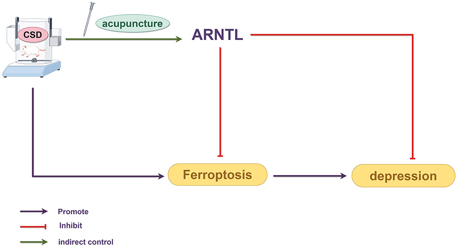 This study revealed a novel mechanism by which electroacupuncture regulates biological clock–dependent autophagy to inhibit ferroptosis, thereby alleviating depression and providing new insights for clinical therapy. However, the regulatory network of ferroptosis is highly complex, and future research should further explore whether electroacupuncture exerts its effects through additional mechanisms, such as oxidative stress, neuroinflammation, or neurotransmitter regulation across different brain regions. In particular, subsequent studies could employ genetic knockdown or knockout models targeting key circadian genes (e.g., ARNTL or CLOCK) to directly verify whether electroacupuncture's neuroprotective and antidepressant effects are dependent on circadian rhythm regulation. Furthermore, gender differences—such as hormonal fluctuations—may influence experimental outcomes; thus, future investigations should include female rats to assess the generalizability of these findings. Ultimately, well-designed clinical trials are warranted to evaluate the long-term efficacy and safety of electroacupuncture for depression, facilitating its translation into clinical application.