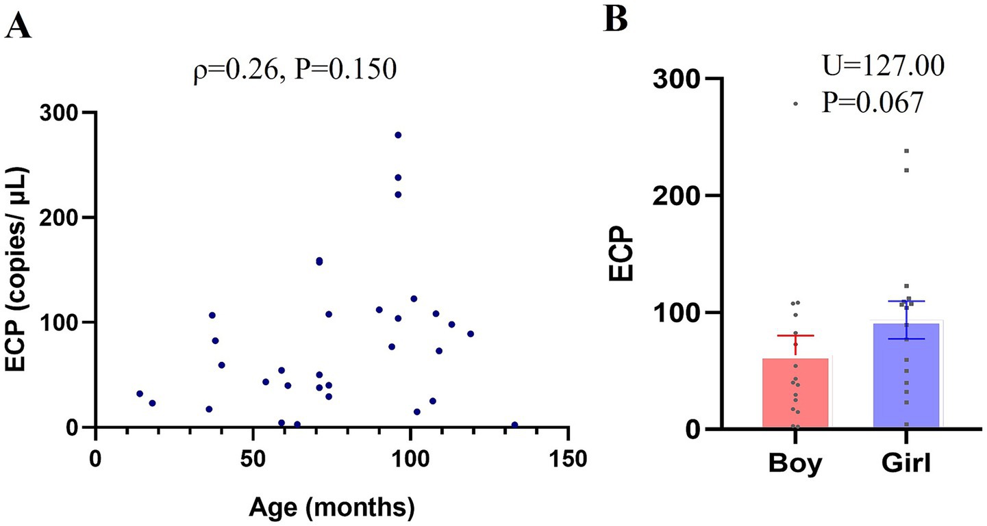 As illustrated in Figure 1, there was no significant correlation between ECP mRNA expression levels and age within the TD group (ρ = 0.26, p = 0.150). Additionally, no significant difference in ECP mRNA expression levels was observed between male and female children in the TD group (U = 177.00, p = 0.067).