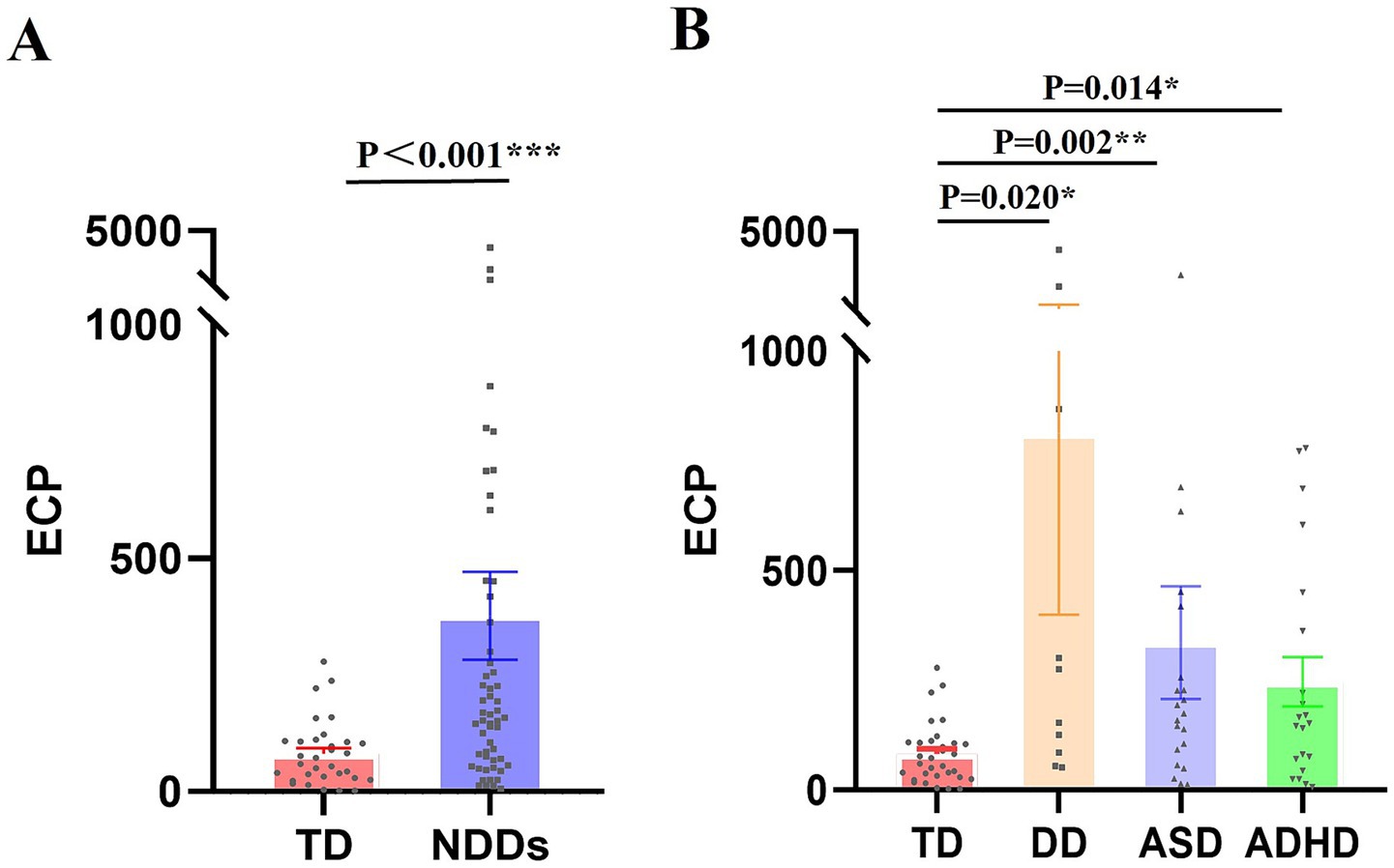 Several limitations of this study warrant mention. First, the heterogeneity and uneven distribution of NDD subtypes in our cohort, which was predominantly composed of ASD and ADHD cases, may limit the generalizability of findings across all NDDs. Second, the subdivision of the NDDs group based on ECP levels yielded small and unbalanced subgroups, which likely reduced the statistical power for clinical correlation analyses and increased the risk of type II errors. Furthermore, the single-center design may affect the generalizability of our findings, and the observational nature of this study precludes causal inference. Future multi-center studies with larger, well-balanced samples and prospective or experimental designs are needed to validate these findings and elucidate the underlying mechanisms.