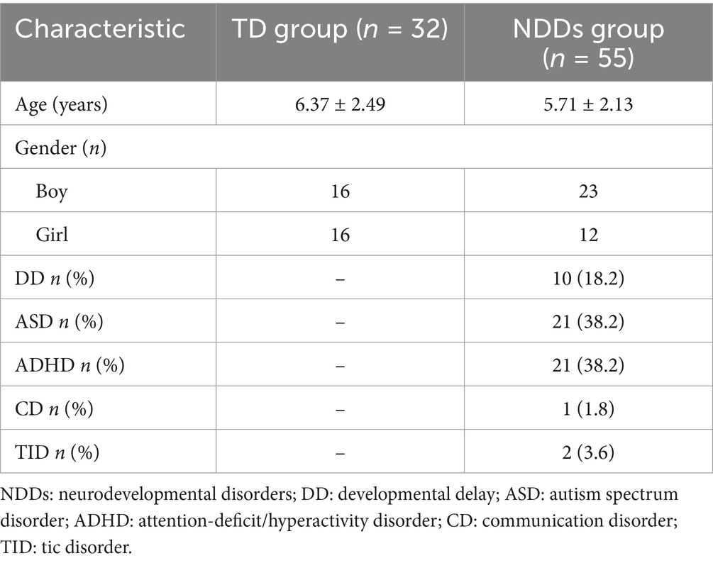 Ultimately, children with allergic diseases were excluded from the study. The TD group comprised 32 children, with a gender ratio of 1:1 and an average age of 6.37 ± 2.49 years. The NDDs group included 55 children with the following diagnoses: 10 cases of DD, 21 cases of ASD, 21 cases of ADHD, 1 case of communication disorder, and 2 cases of tic disorder. The average age in the NDDs group was 5.71 ± 2.13 years, with a higher prevalence of boys over girls at a ratio of 1.9:1 (Table 1).