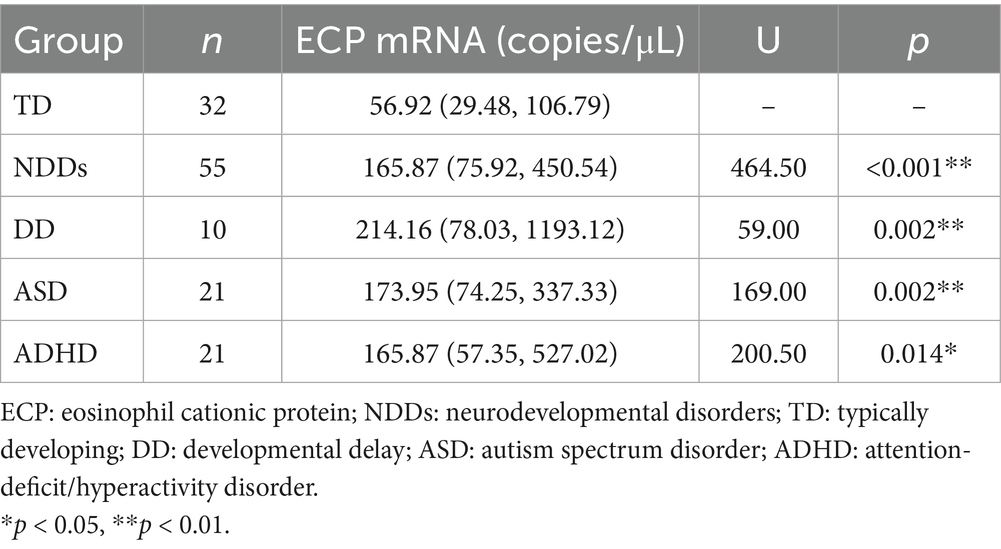 As shown in Table 2, the peripheral-blood ECP mRNA expression level was significantly upregulated in children in the NDDs group compared with the TD group [median 165.87 vs. 56.92 copies/μL, p < 0.001]. Expression levels in children with DD, ASD, and ADHD were also significantly higher than those in the TD group: DD [median 214.16 copies/μL, p = 0.020], ASD [median 173.95 copies/μL, p = 0.002], and ADHD[median 165.87 copies/μL, p = 0.014]. However, there was no statistically significant difference in peripheral-blood ECP mRNA expression between the different disease groups within the NDDs (Figure 2).
