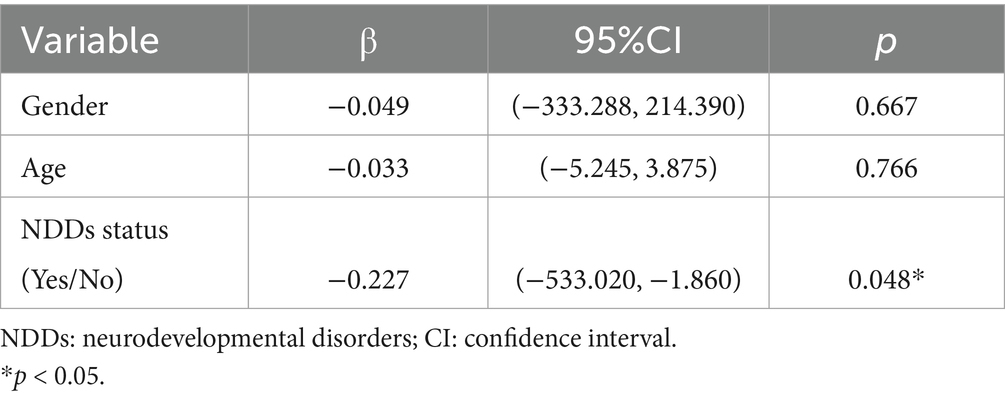 The multiple linear regression model revealed a significant correlation between NDD status and ECP mRNA levels (β = −0.227, 95% CI: −533.020 to −1.860), while age (β = −0.033, 95% CI: −5.245 to 3.875) and gender (β = −0.049, 95% CI: −333.288 to 214.390) showed no significant correlation with ECP mRNA levels (Table 3).