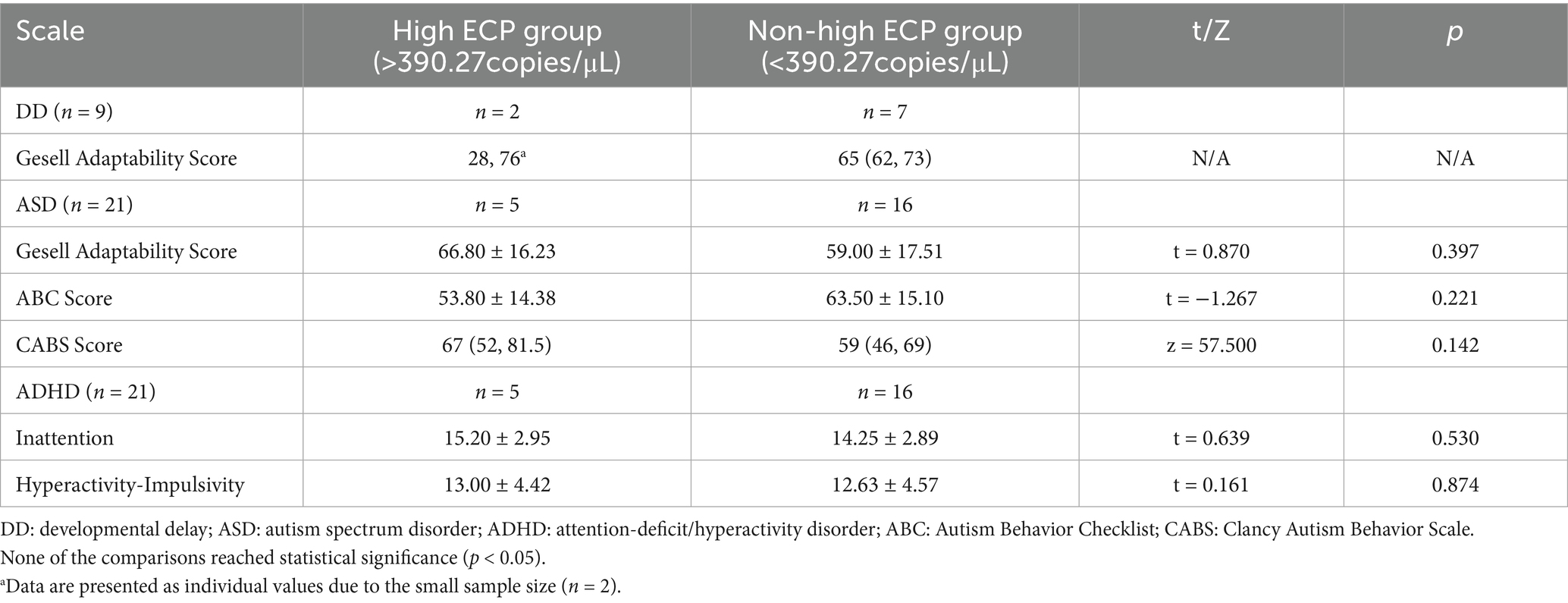 Using 390.27 copies/μL (third quartile) as the threshold, we divided the NDDs group into High ECP (n = 13) and Non-high ECP (n = 42) groups. The High ECP group included 3 DD cases (23.1%), 5 ASD cases (38.5%), and 5 ADHD cases (38.5%), while the Non-high ECP group had 7 DD cases (16.7%), 16 ASD cases (38.1%), 16 ADHD cases (38.1%), 1 communication disorder case (2.4%), and 2 tic disorder cases (4.8%). There were no significant differences in disease composition between the groups (Table 4).