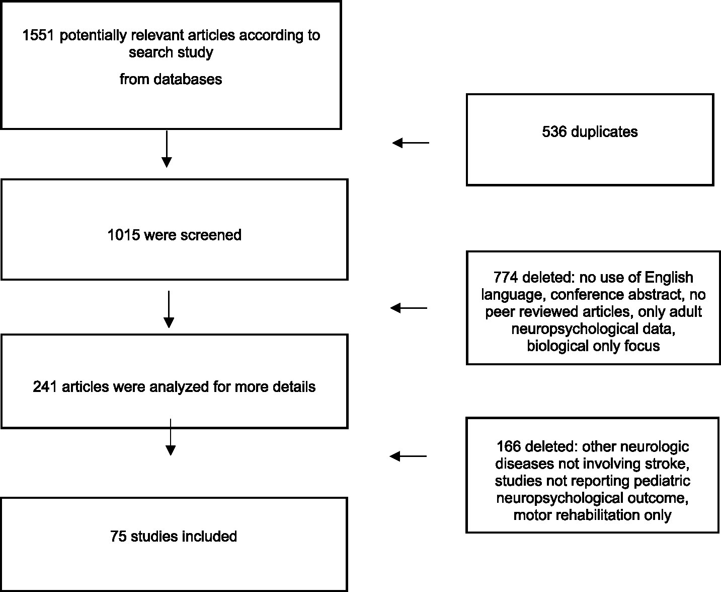 (“pediatric stroke” OR “neonatal stroke”) AND (“cognitive outcomes” OR “cognitive deficits” OR “language problems” OR “memory problems” OR “attention problems” OR “executive function difficulties” OR “visuo-spatial difficulties”) AND (“school problems” OR “academic difficulties” OR “school integration” OR “cognitive rehabilitation”).