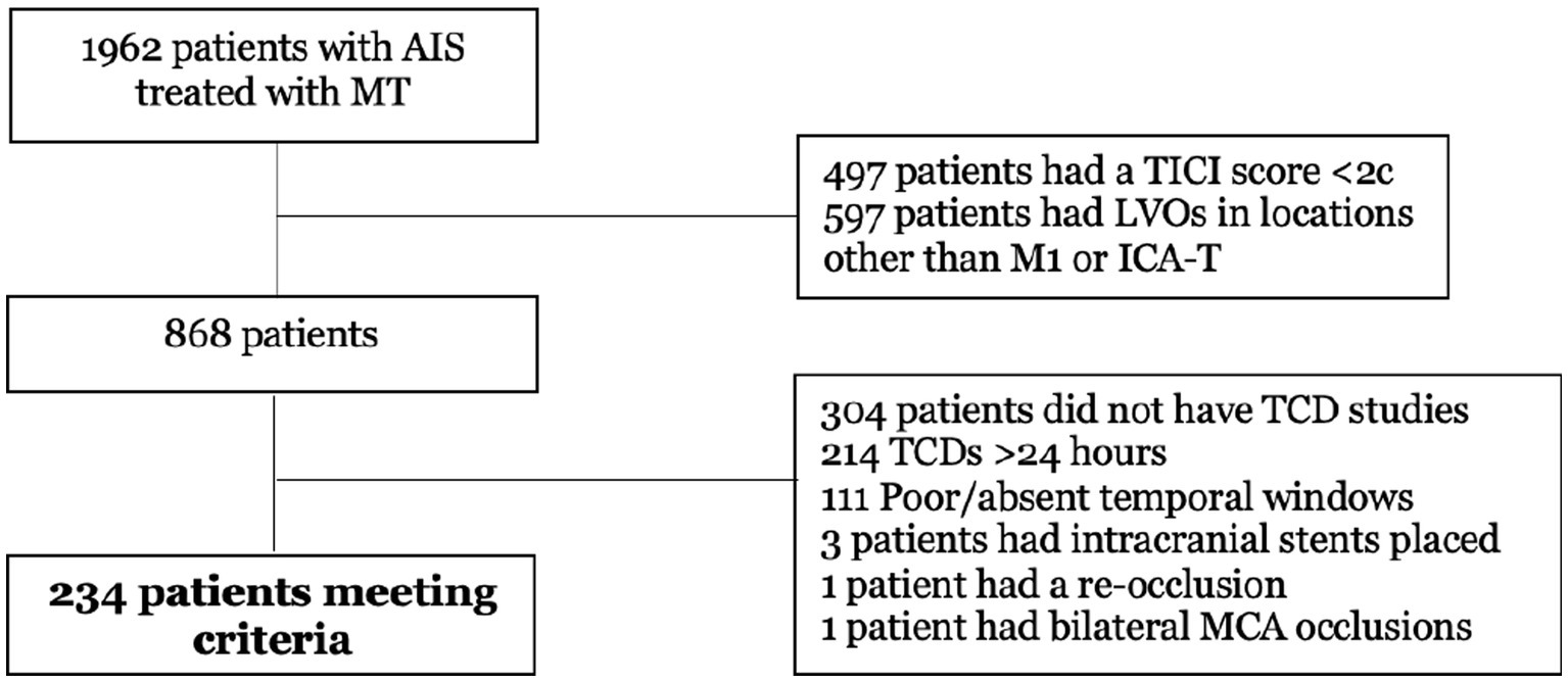 This is a retrospective analysis of a prospective maintained database including consecutive patients with AIS treated with MT at a single large comprehensive stroke center from January 2018 to June 2024. The following inclusion criteria were applied: (1) AIS secondary to a middle cerebral artery (MCA) M1 segment or intracranial internal carotid artery terminus (ICA-T), (2) MT within 24 h of last-known normal with an excellent reperfusion, defined as Expanded Thrombolysis in Cerebral Infarction (eTICI) grade 2c-3, and (3) TCD studies within 24 h of MT reperfusion. Patients were excluded if they had no TCD studies or if poor and/or absent acoustic temporal windows were observed. IVT included both alteplase and tenecteplase. This study was approved by the institutional review board and the need for informed consent was waived due to the retrospective nature of the study.