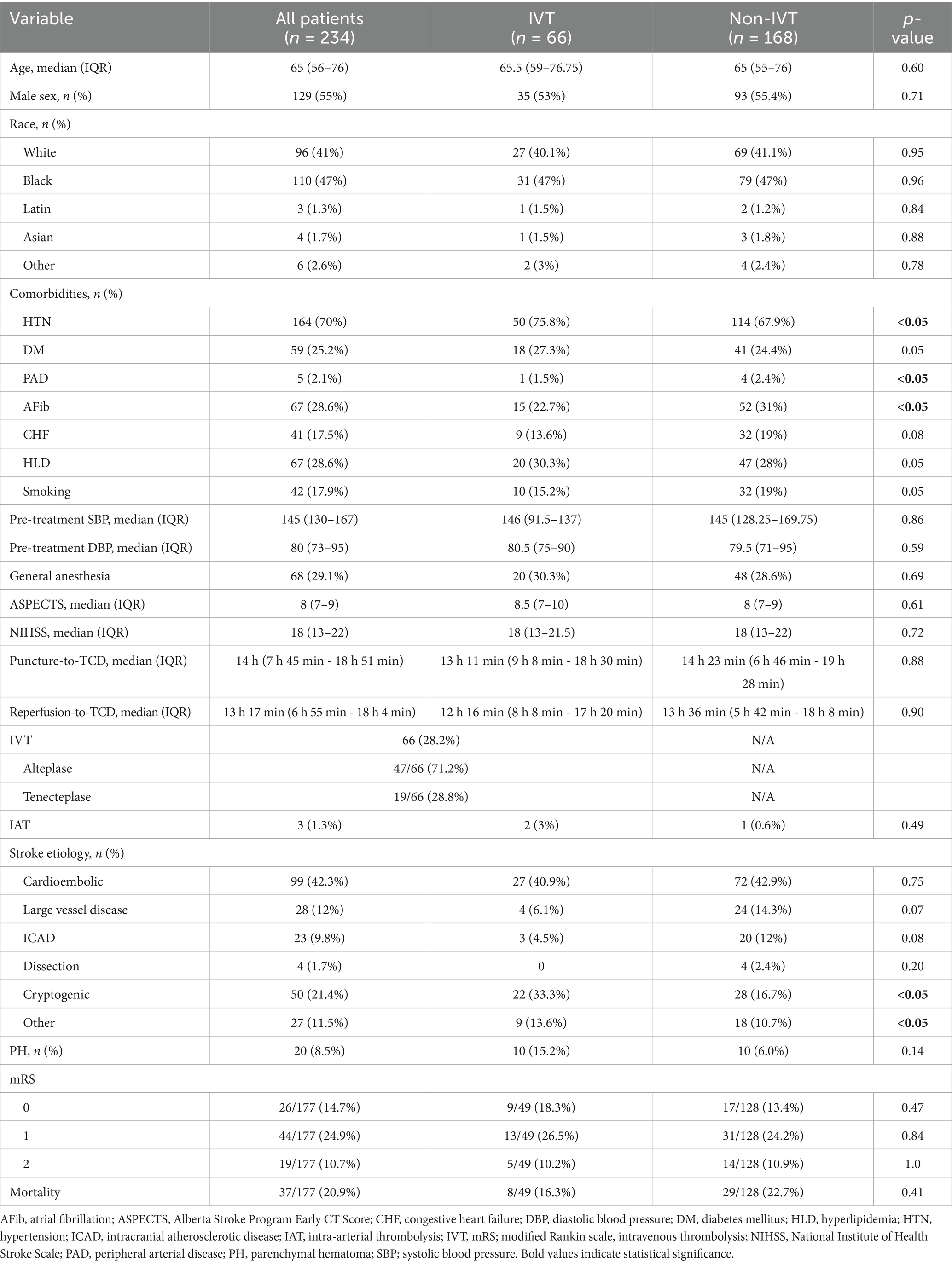 The study flowchart is shown in Figure 1. Of 1,962 patients treated within the study period, 868 had MCA-M1 or ICA-T occlusions and eTICI 2c-3, and 234 (11.9%) met the inclusion criteria. Median age was 65 (IQR 56–76) years, 105 patients (45%) were females, and 110 (47%) were black. Regarding the site of the occlusion, 177 patients (75.6%) had an MCA-M1 and 57 (24.4%) had an ICA-T occlusion. The Alberta Stroke Program Early CT Score (ASPECTS) and the National Institutes of Health Stroke Scale (NIHSS) were similar: 8 (IQR 7–9), and 18 (IQR 13–22), respectively. TCDs were performed at a median time of 13 h 17 min (IQR 6 h 55 min - 18 h 4 min) from recanalization. The rate of IVT was 28.2% (n = 66), and among those patients, 47 (71.2%) received alteplase and 19 (28.8%) received tenecteplase. Intra-arterial thrombolytics (alteplase) were administered in 2 (3%) patients in the IVT group and 1 (0.6%) in the non-IVT group. Of all patients, 20 (8.5%) developed PH. Functional independence and mortality at 90 days were 49.3 and 20.9%, respectively (Table 1). The median ipsilateral MCA PI was 1.19 (0.99, 1.43) and MCA MFV was 60.4 (45.5, 85.9).
