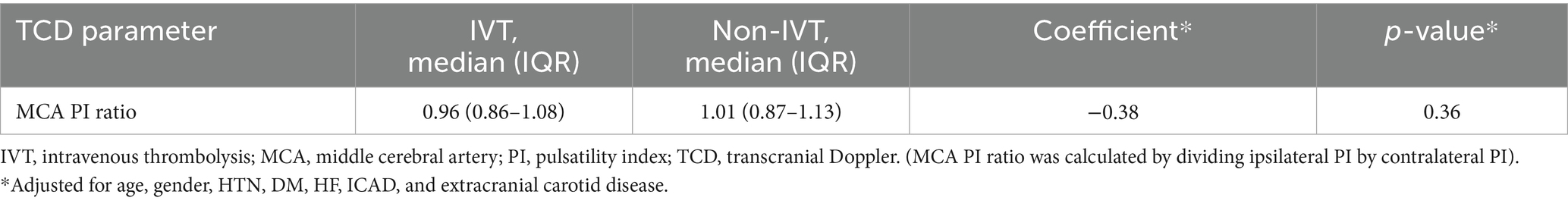 After adjustments, IVT administration was associated with a numerically lower MCA PI ratio (Median 0.96 [IQR, 0.86–1.08] vs. 1.01 [IQR, 0.87–1.13]), with an average 0.38-unit lower PI among IVT patients compared with non-IVT patients, though not reaching statistical significance (p = 0.36; Table 2).
