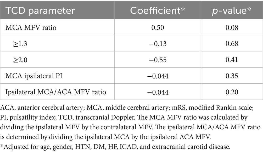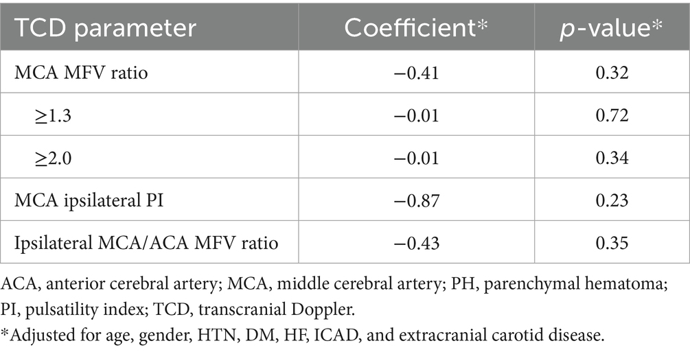There was no significant correlation between ipsilateral MCA PI, MCA MFV ratio, or MCA/ACA MFV ratio with functional outcome at 90 days (Table 3). In the linear logistic regression model, there was no significant correlation found between TCD metrics and the occurrence of PH (Table 4).