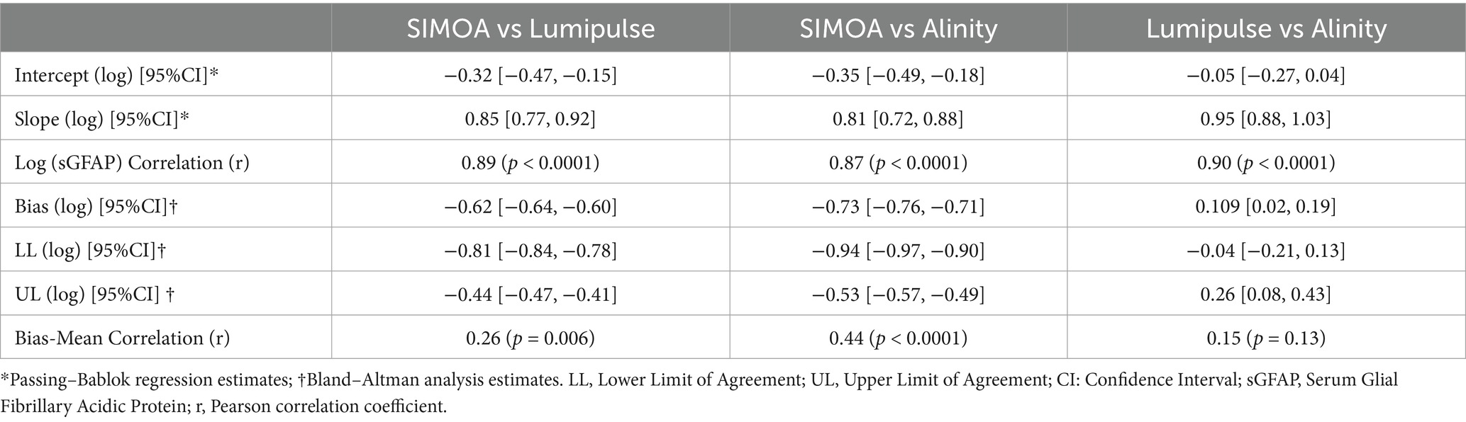 Our findings provide solid support for the clinical utility of fully automated platforms in the quantification of sGFAP. However, the analyses revealed the presence of systematic bias, comprising both constant and proportional components, which must be taken into account when interpreting results.