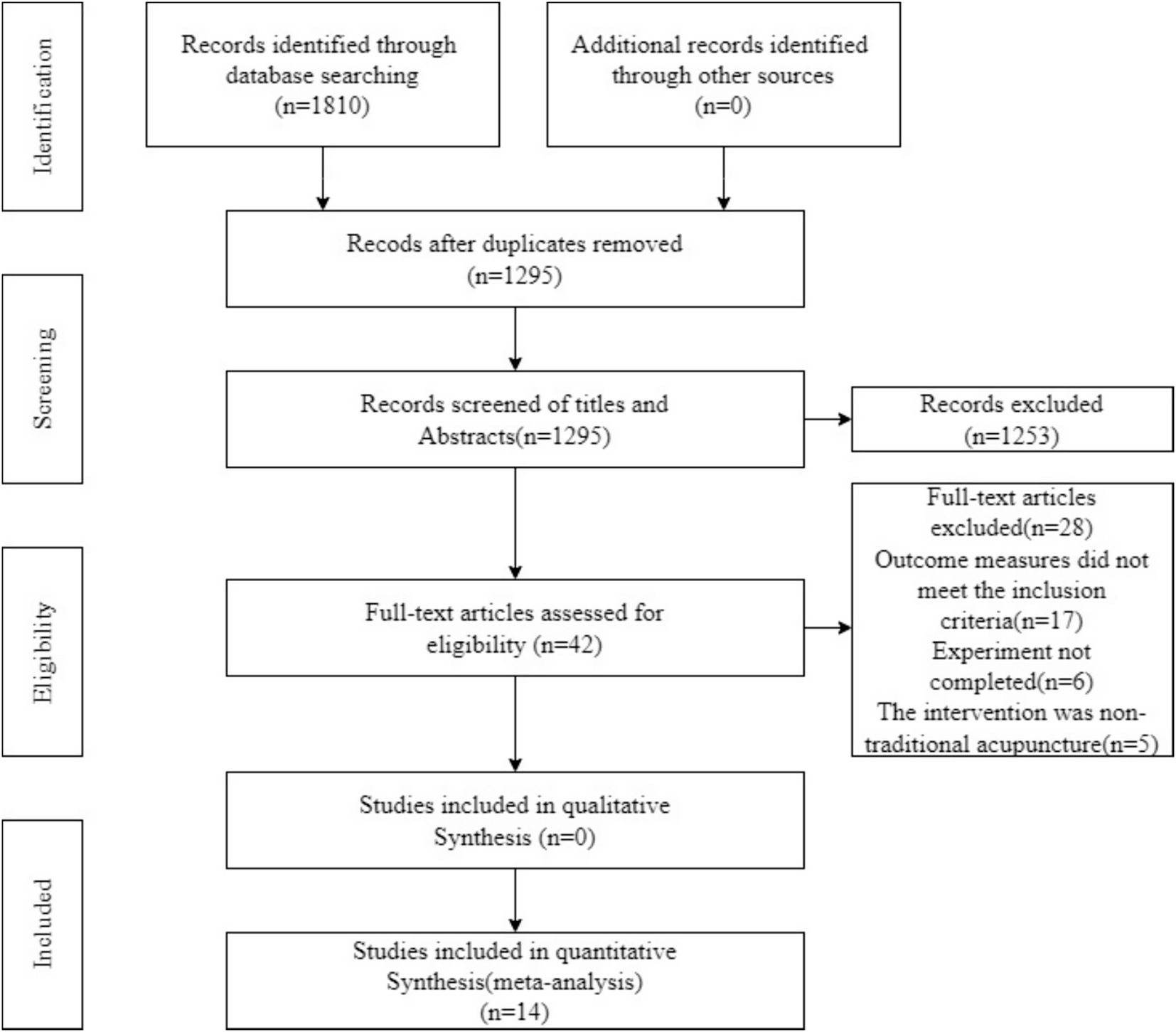 The initial literature search yielded 1810 references. After removing duplicates, 1,295 articles were evaluated. Of these, 1,253 were excluded based on title and abstract review. An additional 42 references were scrutinized in detail, with 28 being excluded. 14 studies were finally selected in this review (Figure 1).