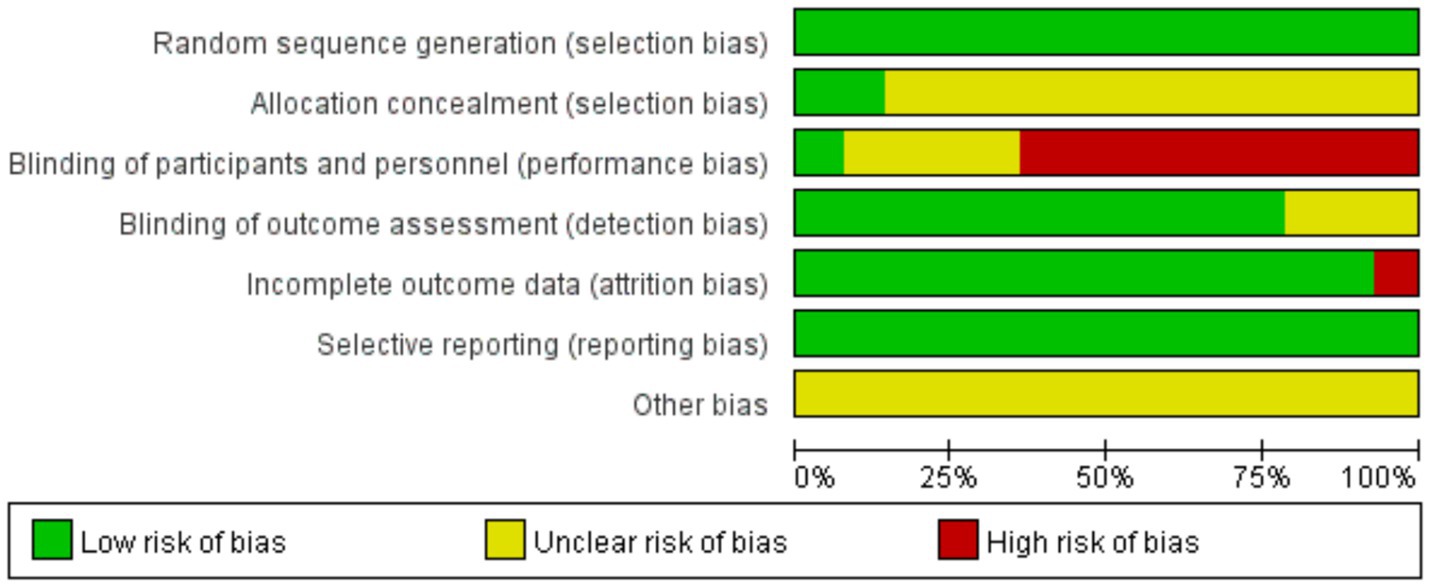 The methodological quality of the included studies was assessed independently by two reviewers (HJ and RM) using the Cochrane Risk of Bias Tool (14). The reviewers evaluated the following domains: random sequence generation (selection bias), allocation concealment (selection bias), blinding of participants and personnel (performance bias), blinding of outcome assessment (detection bias), incomplete outcome data (attrition bias), selective reporting (reporting bias), and other potential sources of bias. The two reviewers conducted the assessments independently and without consultation. For each domain, judgments were assigned as ‘Low risk’, ‘High risk’, or ‘Unclear risk’ of bias, along with supporting information from the study publications. After the initial assessment, they compared their judgments. The certainty of the evidence was graded using the GRADE (Grading of Recommendations Assessment, Development, and Evaluation) according to (GRADE handbook). Any discrepancies were resolved through discussion. If a consensus could not be reached, a third reviewer (YFH) made the final decision, ensuring a consistent and unbiased appraisal.