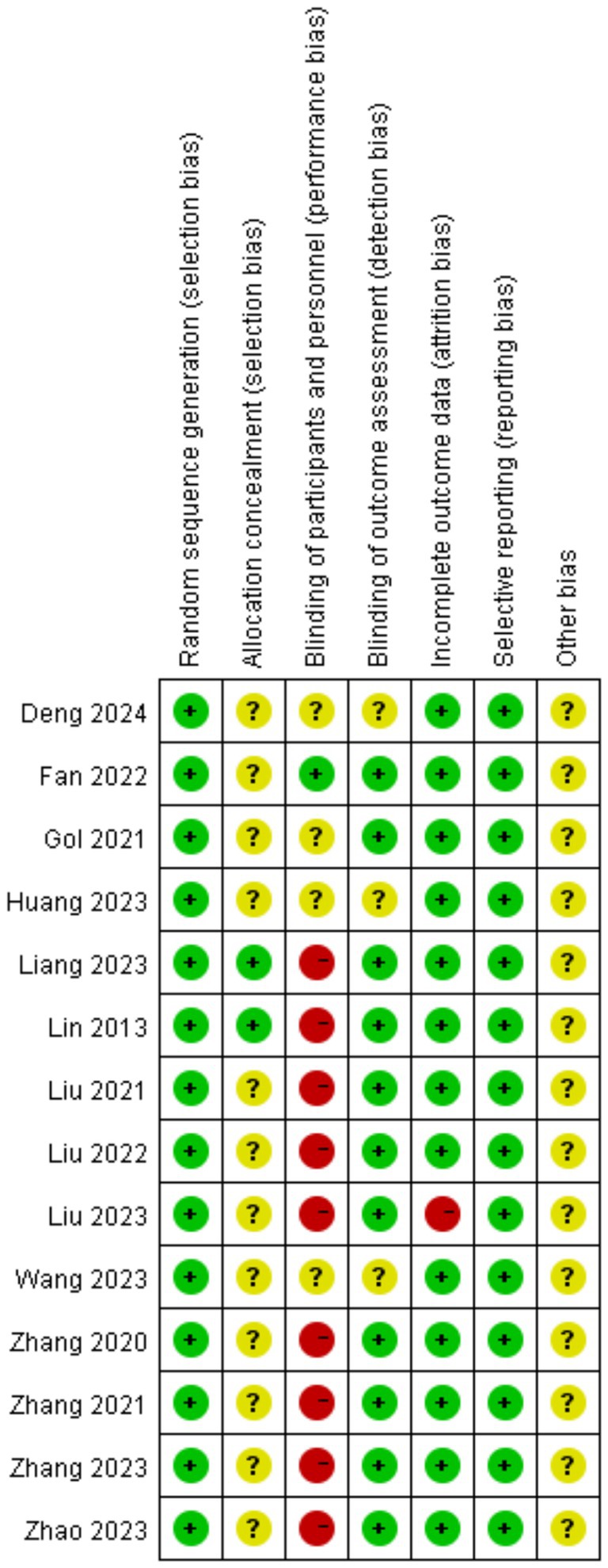 The methodological quality assessment of included studies, evaluated using the Cochrane Risk of Bias Tool, revealed mixed risk profiles across seven domains: random sequence generation and allocation concealment demonstrated predominantly low risk (75–100% and 50–75% of studies, respectively), indicating robust randomization practices, whereas performance bias (blinding of participants/personnel) and detection bias (blinding of outcome assessors) exhibited notable limitations, with 25–50% of studies rated as high risk due to inadequate blinding protocols inherent in acupuncture trials. Attrition and reporting biases were generally low (<25% high risk), supporting data completeness and transparency. Specific concerns included studies by Zhang et al. (17), showing high performance/detection bias risks, potentially inflating treatment effects, and Chinese-language studies [Liu (20) and Deng et al. (25)] lacking detailed blinding descriptions. These findings underscore the need for standardized blinding methodologies (e.g., non-penetrative sham devices) and explicit reporting in future trials to minimize placebo effects and enhance validity (Figures 2, 3).