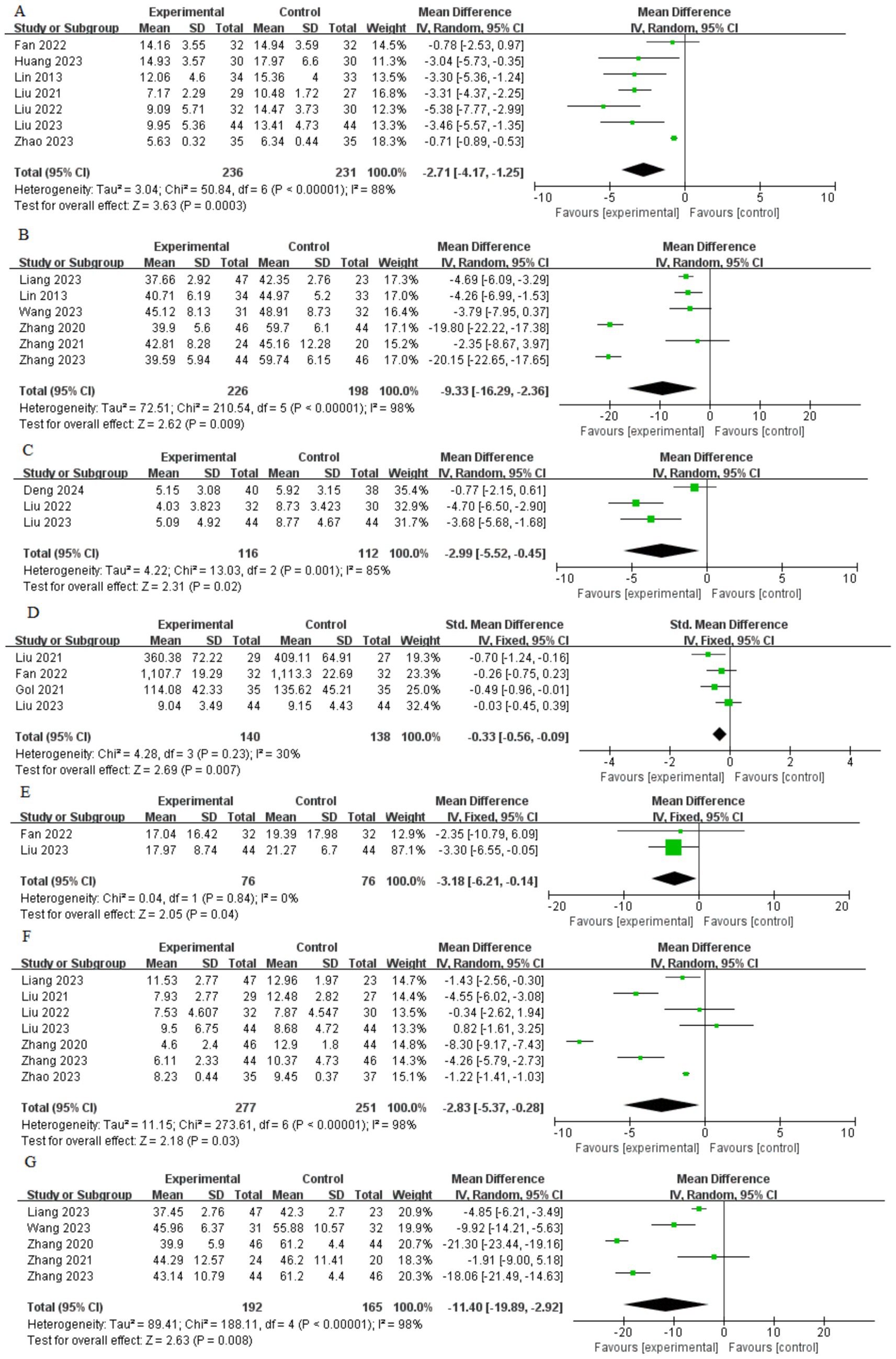 Figure 4. Forest plot of meta-analysis. (A) HAMA; (B) SAS; (C) GAD-7; (D) CORT; (E) ACTH; (F) PSQI; (G) SDS.
