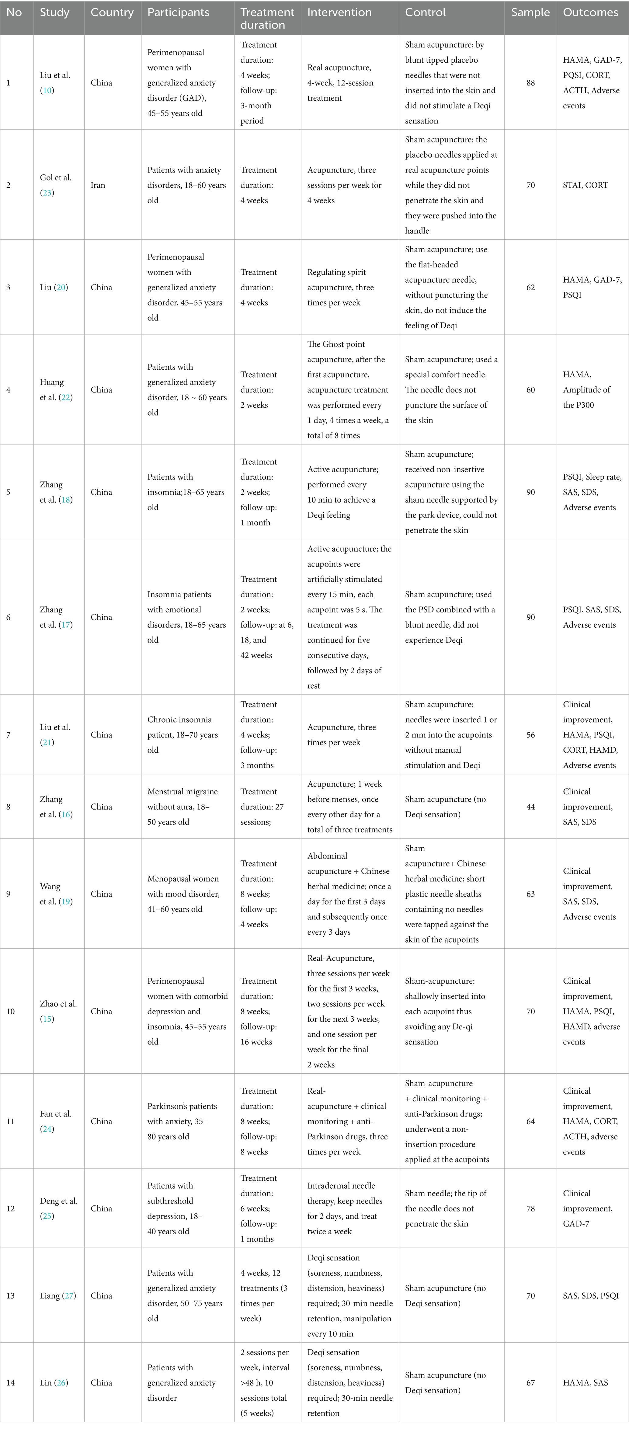 The 14 trials (10, 15–27) had 968 participants in total. All trials were conducted in China. The sample size of studies ranged from 44 to 90. Treatment durations spanned 2–8 weeks, with follow-up periods ranging from 1 month to 42 weeks. Acupuncture techniques included real acupuncture, regulating spirit acupuncture, ghost point acupuncture, electroacupuncture, abdominal acupuncture combined with herbal medicine, and intradermal needle therapy. Control groups consisted of sham acupuncture (non-insertive/blunt needles without Deqi sensation), sham acupuncture (non-penetrative), and sham needle devices. Common outcomes measured included HAMA, GAD-7, PSQI, CORT/ACTH levels (Table 1).