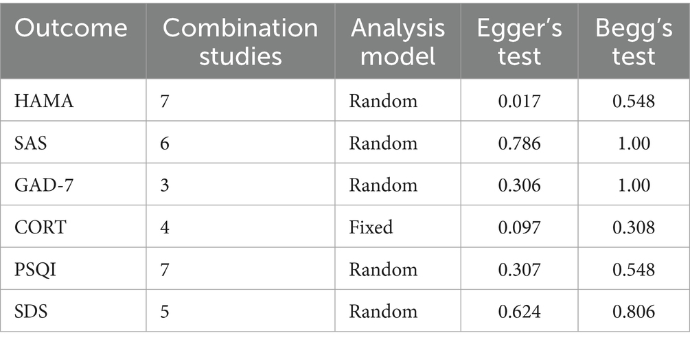 Because of the limited number of included studies, a funnel analysis was not conducted to evaluate publication bias. Therefore, Egger’s regression test and Begg’s rank correlation test were conducted for these outcomes (Table 2). Most outcomes showed no significant evidence of publication bias (p > 0.05), except for HAMA, where Egger’s test indicated potential small-study effects (p = 0.017), though Begg’s test was not significant (p = 0.548).