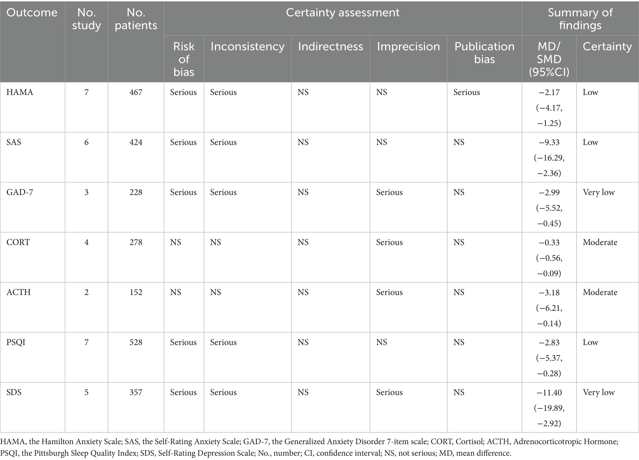 The overall certainty of the evidence for each outcome, as assessed by the GRADE approach, is summarized in Table 3. The evidence certainty was rated as “low” for HAMA, SAS, and PSQI, due to serious risk of bias and serious inconsistency. The certainty for GAD-7 and SDS was “very low,” due to additional serious imprecision. The evidence for CORT and ACTH was rated as “moderate,” primarily downgraded for imprecision.
