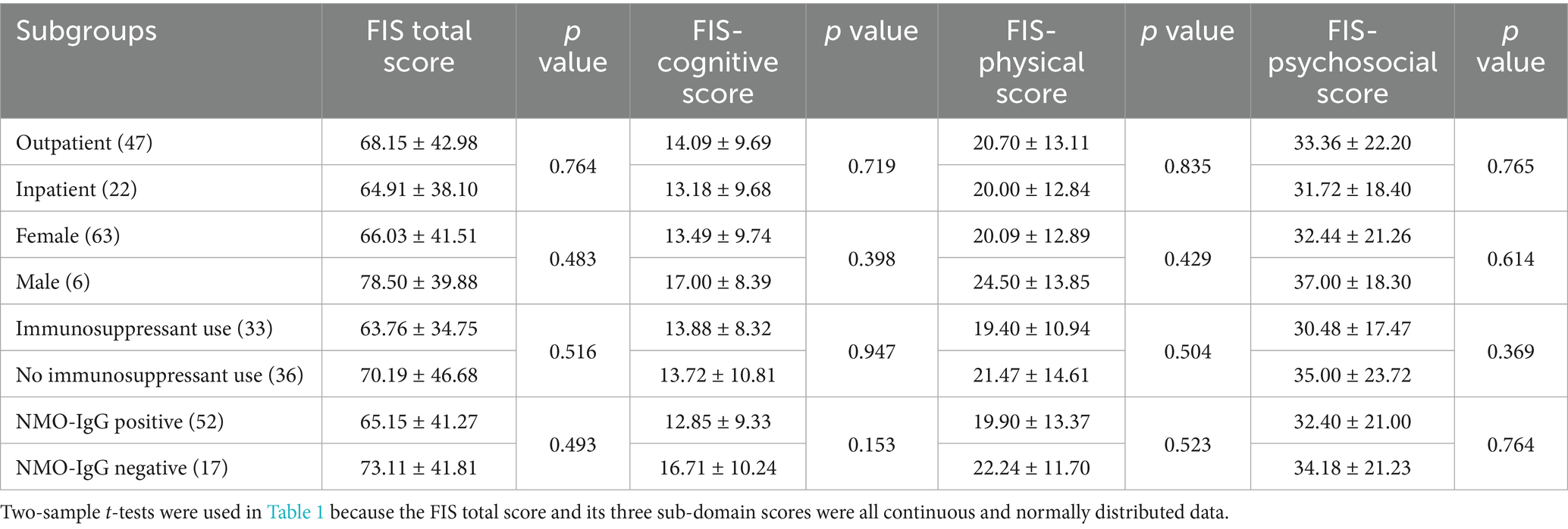 Results: Sixty-nine patients (mean age 40.13 years, male/female 6/63) were enrolled. The median Expanded Disability Status Scale (EDSS) score was 3, and 75.4% were seropositive for NMO-IgG. The total FIS score was 67.12 ± 41.24, accounted for by the three sub-dimensions: cognitive fatigue 13.80 ± 9.63, physical fatigue 20.48 ± 12.93, and psychosocial fatigue 32.84 ± 20.94. EDSS scores were positively correlated with total fatigue and all its subdomains; the number of relapses was positively correlated with cognitive fatigue; total fatigue and its subdomains were moderately and negatively correlated with all QOL dimensions.