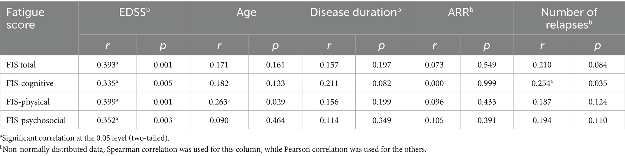 EDSS correlated positively and weakly with total FIS and all three subscale scores (p < 0.05). Age showed a weak positive correlation with FIS-Physical (p < 0.05), and relapse count correlated weakly with FIS-Cognitive (p < 0.05). No other significant differences or correlations were observed (p > 0.05); details are given in Tables 1, 2.