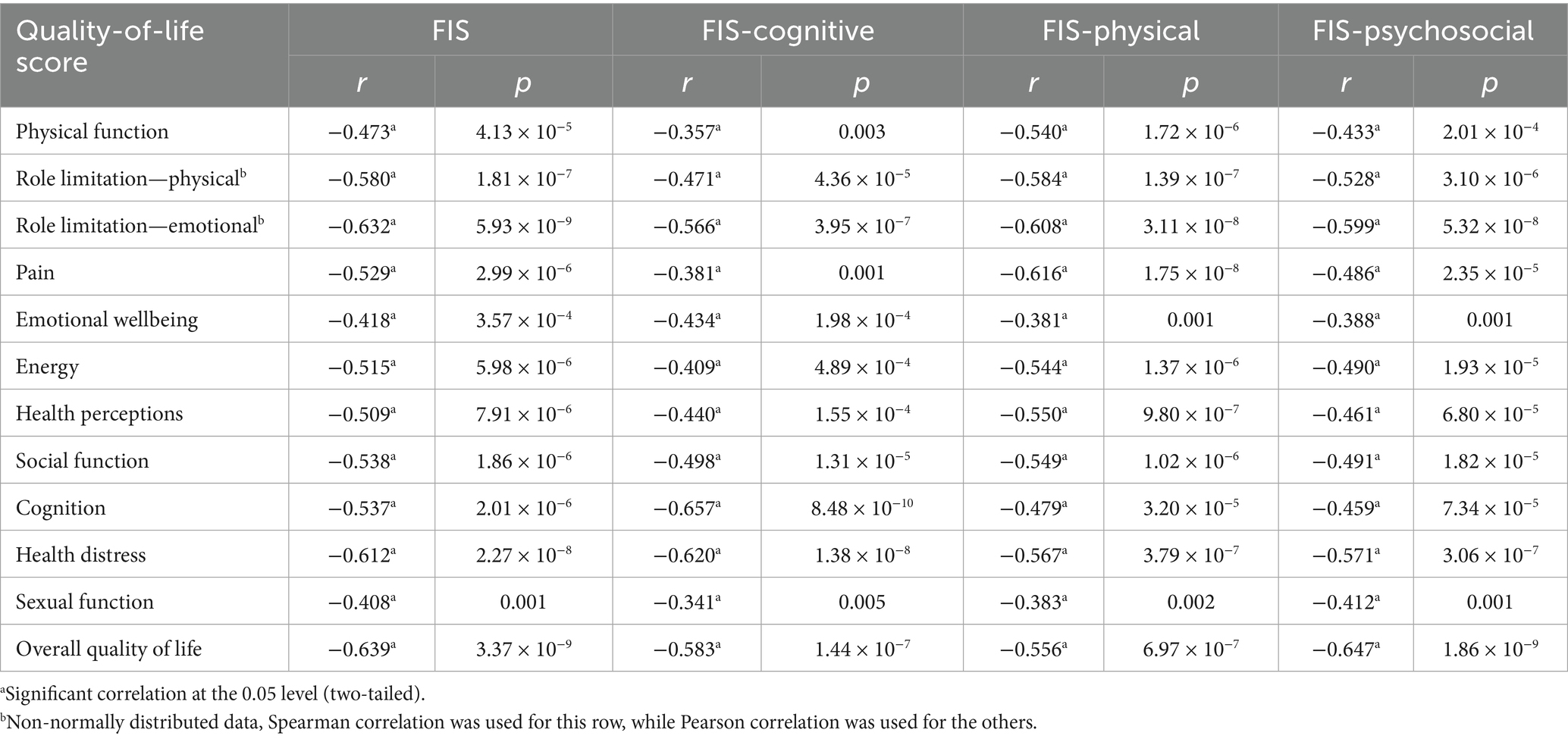 Total fatigue score and all subscale scores correlated weakly/moderately and negatively with all 12 quality-of-life domains (p < 0.01); detailed data are presented in Table 3.