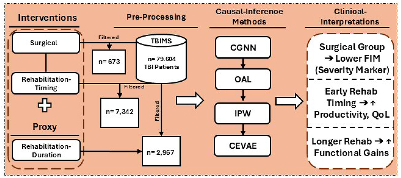 Figure 1. Overview of the study workflow, including data extraction from the TBIMS national database, categorization into surgical and rehabilitation cohorts, application of causal inference methods (CGNN, OAL, IPW, CEVAE), and clinical interpretation of effects on functional outcomes such as FIM scores, productivity, and quality of life.