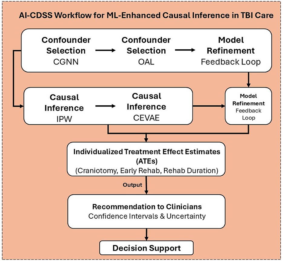 Figure 2. The pipeline integrates confounder selection (Outcome Adaptive Lasso, Causal Graph Neural Networks), causal inference (Inverse Probability Weighting, Causal Effect Variational Autoencoder), and model refinement within a feedback loop to generate individualized treatment effect estimates (ATEs) for interventions such as craniotomy, early rehabilitation, and rehabilitation duration. These estimates, along with confidence intervals and uncertainty measures, can guide data-driven recommendations within AI-driven clinical decision support systems for personalized TBI care.