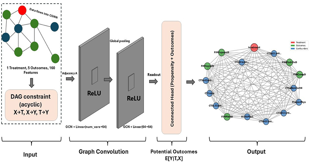 Figure 3. Graphical representation of the causal graph neural network (CGNN) framework, adjsuted for the surgical intervention scenario. The architecture consists of three main components: an input layer encoding one treatment variable (Required Craniotomy, red node), five cognitive and functional outcomes (green nodes), and 160 baseline covariates (blue nodes); a graph convolution module with directed acyclic graph (DAG) constraints enforcing acyclic information flow (X→T, X→Y, T→Y), two stacked graph convolution layers with ReLU activation, and a connected readout head estimating E[Y|T, X]; and an output layer representing learned causal dependencies among treatment, outcomes, and top ranked confounders. The top 10 confounders identified via Outcome Adaptive Lasso and CGNN include Pre-existing Physical Conditions (PreconPhys), Acute Payor Source (AcutePay1), CT compression (CTComp), Intraventricular Hemorrhage (CTIntraventricular), and cortical lesion locations detected on CT imaging: Right Parietal (CT5c2CorticalRPar), Left Occipital (CT5d1CorticalLOcc), Right Frontal (CT5b1CorticalRFront), Left Frontal (CT5a1CorticalLFront), Right Temporal (CT5b2CorticalRTemp), and Right Non-Cortical (CT6aNonCortN). Directed edges represent learned causal relations derived from adjacency matrix A and feature embeddings across graph convolution layers.
