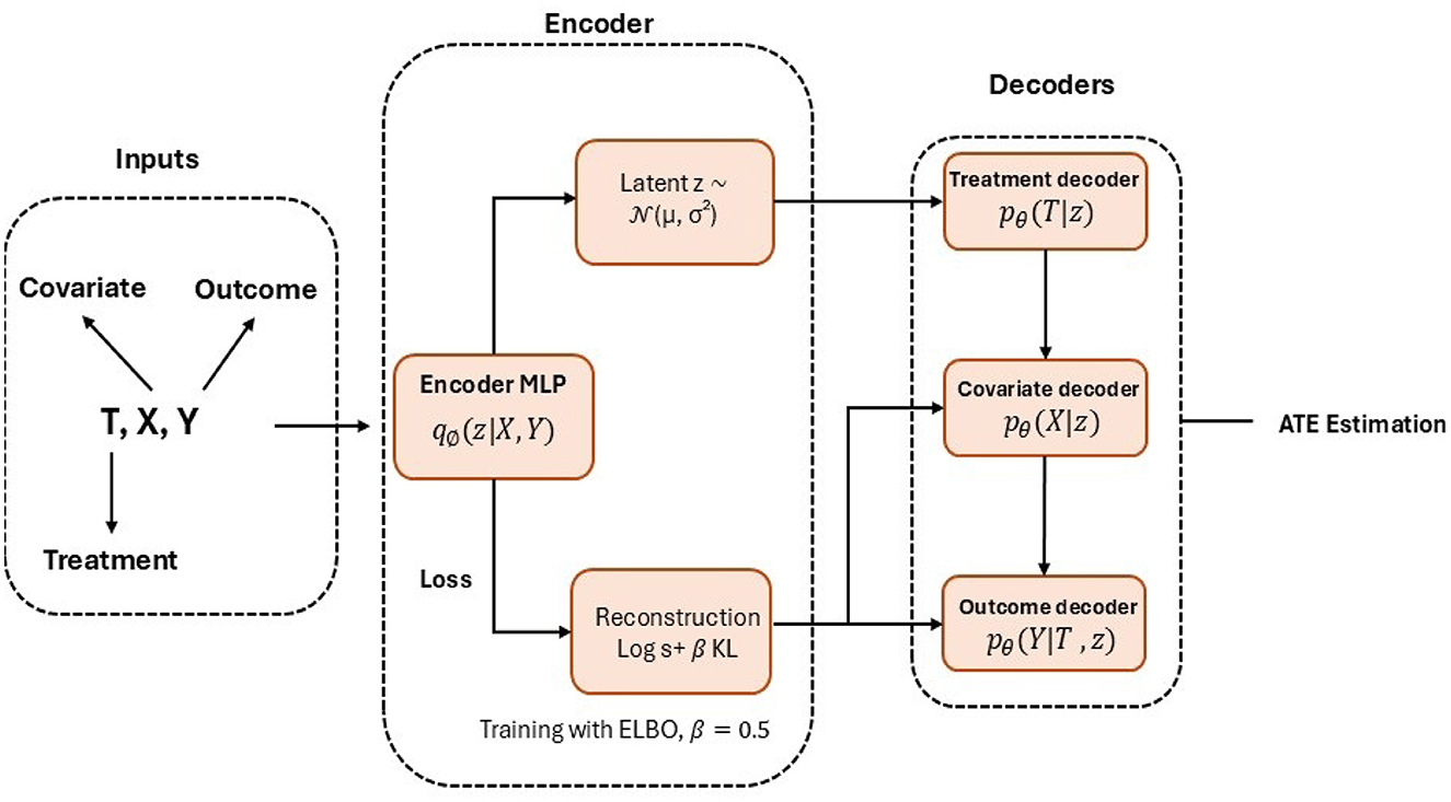 Figure 4. Graphical representation of the causal effect variational autoencoder (CEVAE) architecture. The framework consists of three main components: an input module that encodes observed covariates (X), treatment indicator (T), and outcomes (Y), representing the observed data generation process (X→T, X→Y, T→Y); an encoder network (qϕ(z|X, T, Y)) that infers latent confounders through a multilayer perceptron; and a decoder network (pθ) composed of three conditional branches–pθ(T|z), pθ(X|z), and pθ(Y|T, z) that reconstruct treatment assignment, covariates, and outcomes, respectively. Model training minimizes the evidence lower bound (ELBO) loss, defined as , with β = 0.5 controlling the regularization strength. The model estimates average treatment effects (ATE) as the difference between potential outcomes, E[Y|T = 1, X]−E[Y|T = 0, X].