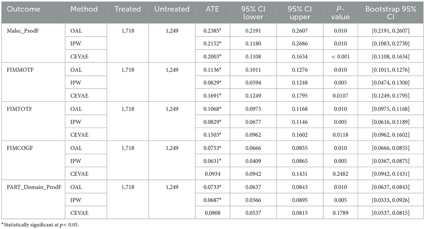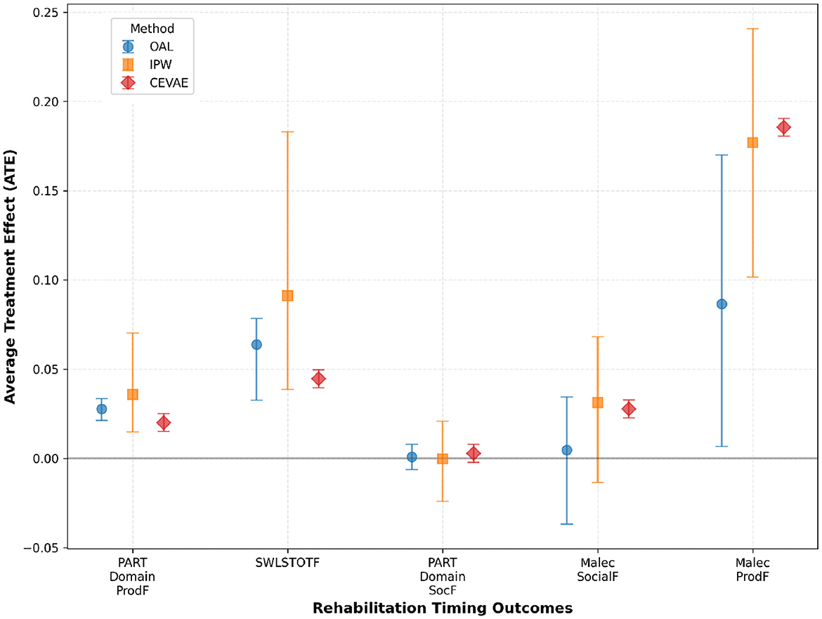 Social, participation, and productivity outcomes provided contradictory results by approaches. Conventional causal approaches (OAL, IPW) estimated small or no effects for social participation domains. CEVAE found moderate positive correlations. These differences arise from how each model is built. IPW conditions on ignorability and uses measured covariates only. It is sensitive to missing or crude covariates. OAL discourages weak predictors and shrinks small effects to zero. CEVAE incorporates latent layers that could capture hidden or nonlinear patterns. CEVAE could overfit or be ill conditioned. When CEVAE showed effects not seen in IPW or OAL, they likely reflected unobserved or nonlinear confounding. CEVAE results were taken as exploratory. More reliance was placed on effects seen in two or more estimators. This pattern concurs with multicenter studies which show that social reintegration outcomes are less frequently affected by intervention timing compared to functional domains. Such heterogeneity likely reflects psychosocial impacts that transcend the timing of rehabilitation in adults with TBI, a group similar to our dataset (30, 31). The strong prediction success of treatment (93% average) suggests prevailing selection effects. Rehabilitation timing decisions appear extensively organized and guided by patient factors.