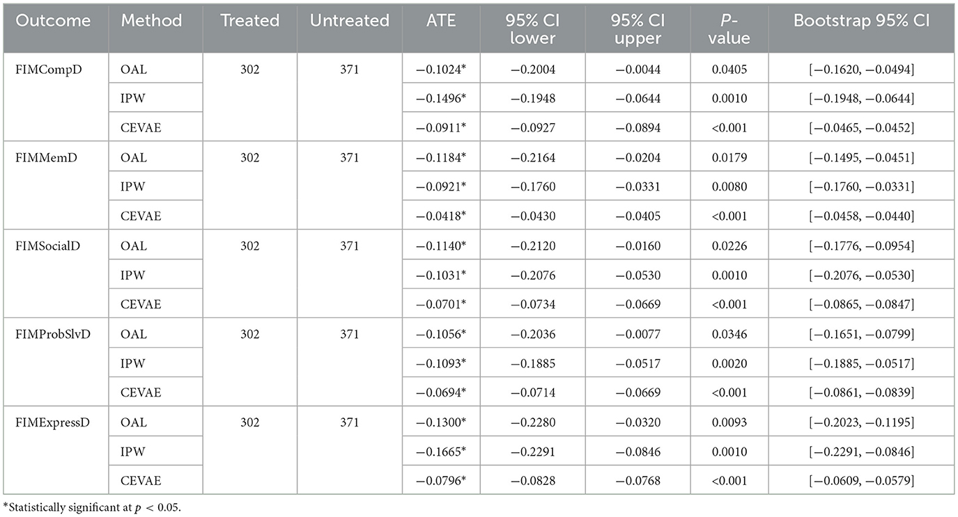 We estimated the effects of craniotomy on discharge cognitive and functional outcomes using FIM domains: comprehension, memory, social interaction, problem solving, and expression. The analysis included 302 treated and 371 untreated patients. Across methods, craniotomy was associated with lower FIM scores in all domains. According to Table 1, OAL and IPW produced consistent, statistically significant negative estimates across all outcomes, with ATEs ranging from −0.10 to −0.17. CEVAE also showed negative effects, although with smaller absolute values, reinforcing the robustness of the findings. For comprehension and memory, the estimated effects ranged from −0.04 (CEVAE) to −0.15 (IPW), suggesting a decline in cognitive functioning post-craniotomy. For soical interaction and problem solving, the effects were similarly negative, with estimates between −0.07 (CEVAE) and −0.11 (IPW). The largest negative effects were observed for expression, where estimates ranged from −0.08 (CEVAE) to −0.17 (IPW). Craniotomy showed negative effects across all domains. OAL and IPW produced similar estimates. CEVAE showed smaller but still negative values. The adverse pattern persisted after adjusting for latent confounding. The agreement among methods suggests that lower outcomes in surgical patients likely reflect greater clinical complexity, not model bias.