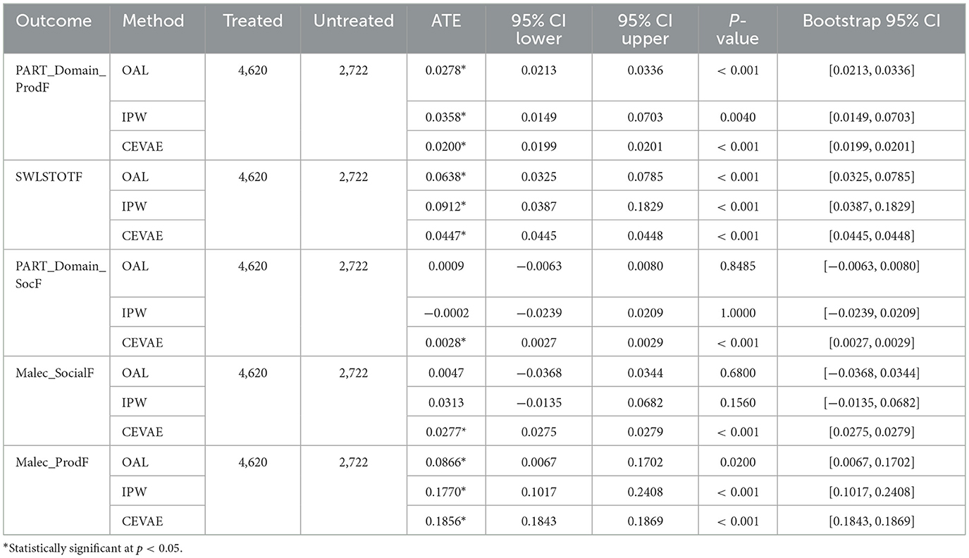 Step 3: average effects estimation using latent confounding. We applied two complementary causal inference methods: Inverse Probability Weighting (IPW) and Causal Effect Variational Autoencoder (CEVAE).