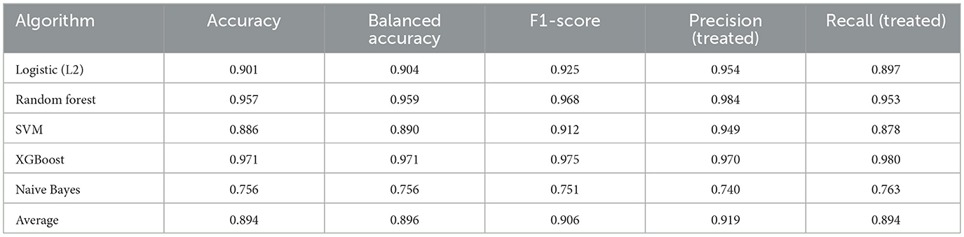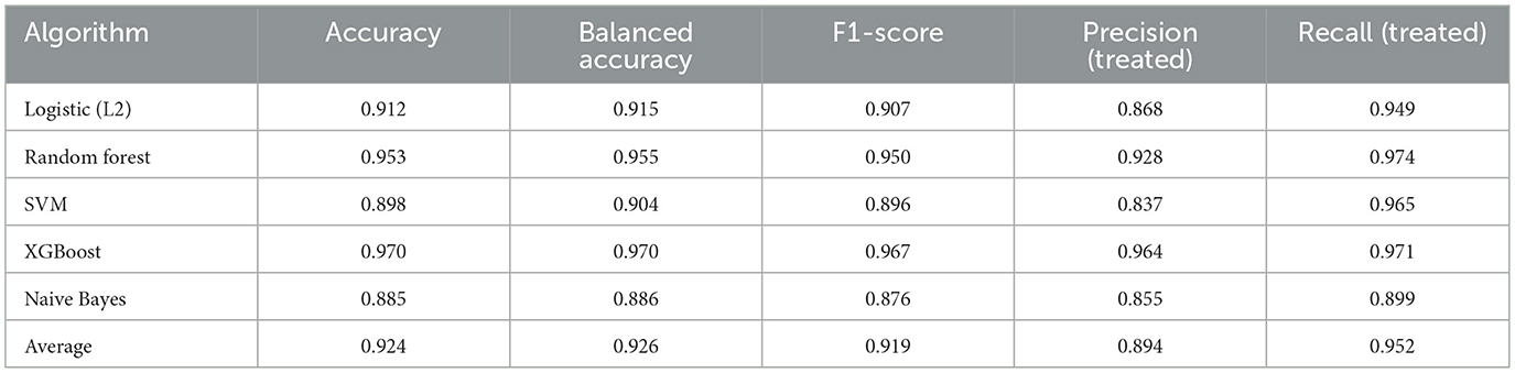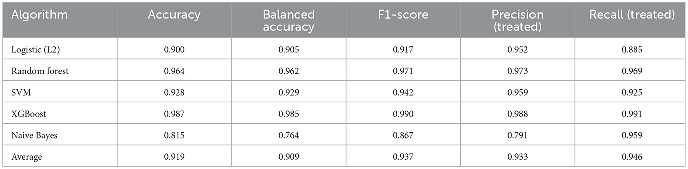 The models consistently performed well across interventions, with XGBoost yielding the most reliable results across all three cohorts, followed by Random Forest. The high prediction accuracy (>90% average) across all algorithms confirms the strong confounding by indication present in treatment assignment decisions.