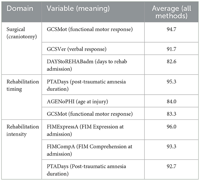 Table 7. Three top predictors by intervention domain (averaged across six feature-selection methods).