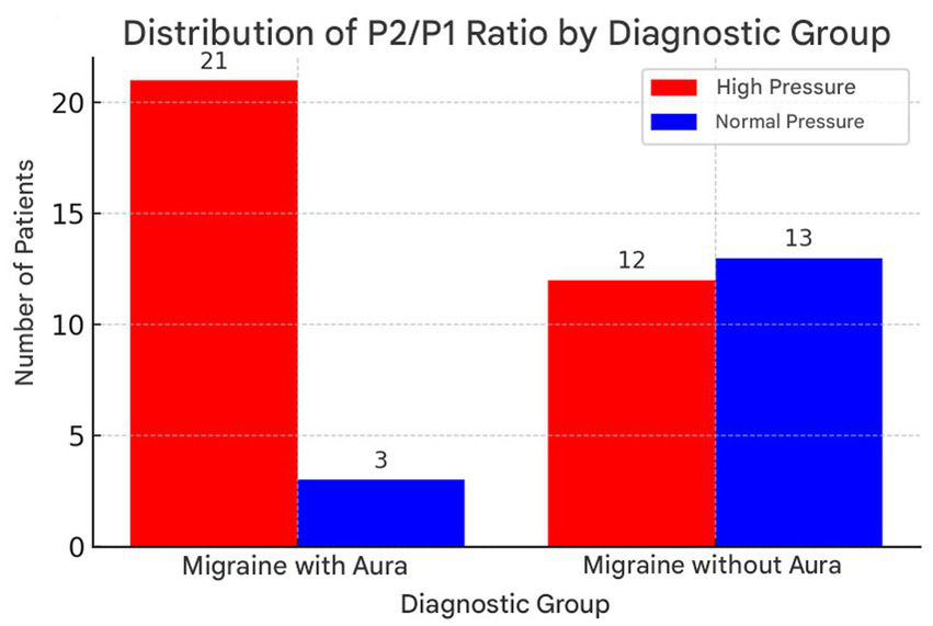 Logistic regression analysis indicated that an elevated P2/P1 ratio was an independent predictor for the presence of migraine with aura, even after adjusting for age, gender and comorbidities. These findings suggest that monitoring cerebral compliance may have potential as an auxiliary diagnostic tool in differentiating between migraine subtypes.