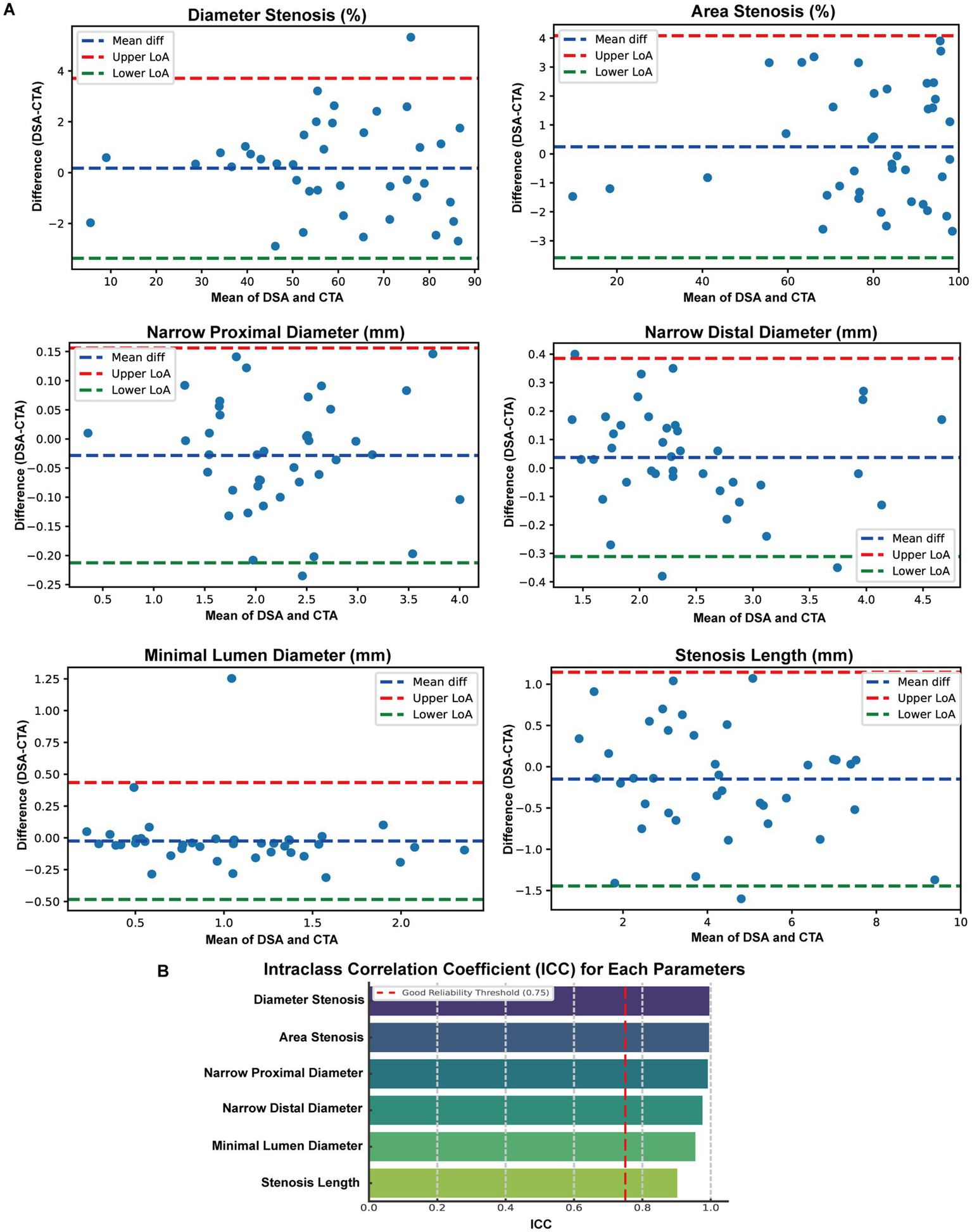 Consistency Analysis of Morphological Parameters between DSA and CTA. (A) Bland-Altman plots were employed to compare six paired anatomical measurements obtained from digital subtraction angiography (DSA) and computed tomography angiography (CTA), encompassing percent diameter stenosis, percent area stenosis, proximal diameter, distal diameter, minimal lumen diameter, and stenosis length. The blue dashed lines represent the mean differences, while the red and green dashed lines denote the Upper and Lower 95% limits of agreement (LoA), respectively. (B) Intraclass correlation coefficient (ICC) analysis results for the same six parameters.