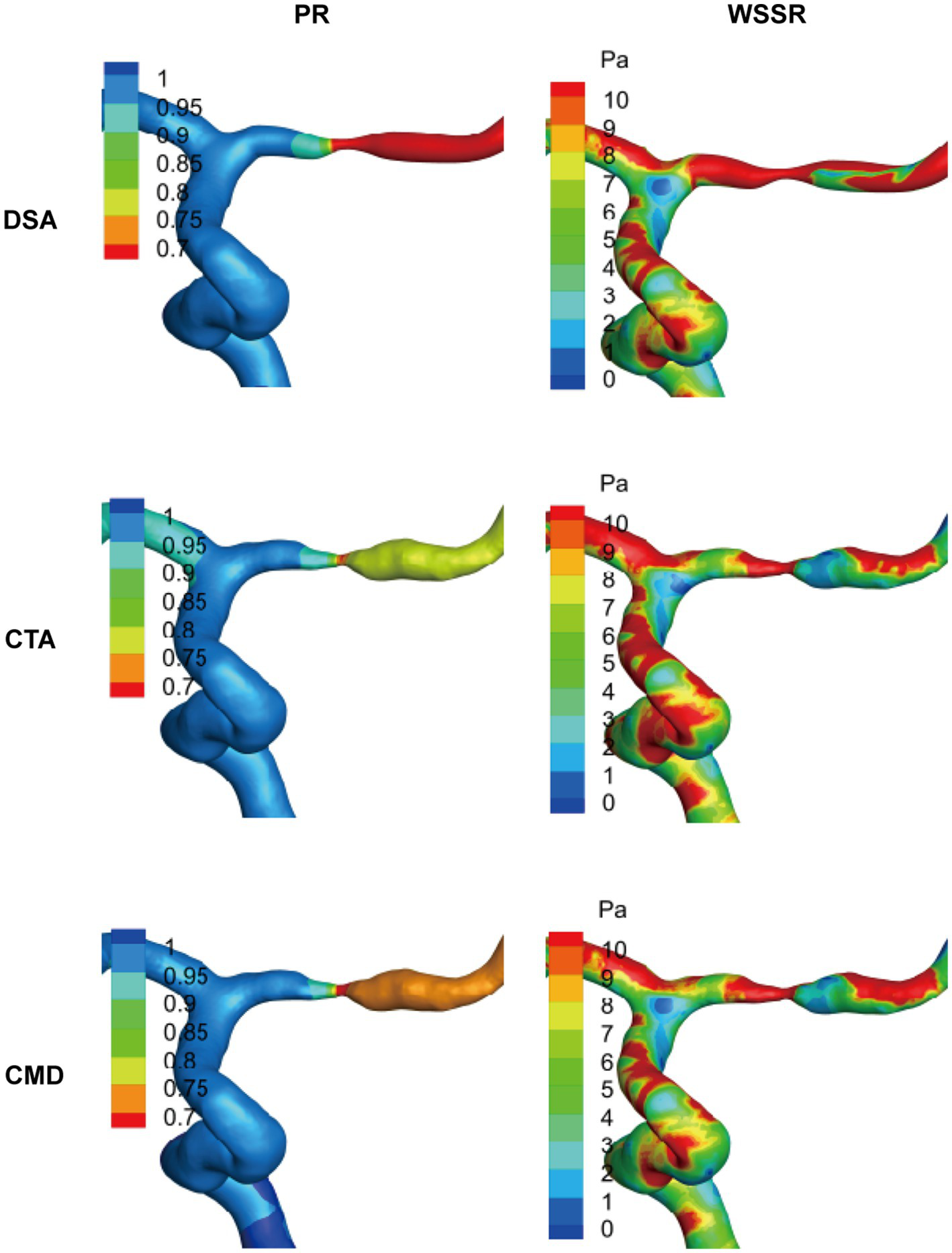 CTA-based models demonstrated excellent consistency with DSA in anatomical measurements (ICC > 0.90). The CMD approach enhanced consistency in functional metrics, with CMD-derived PR and WSSR highly concordant with DSA results. When using CTA alone, WSSR was slightly underestimated, particularly in middle artery lesions. Subgroup analysis indicated that lesion location significantly influences flow and shear stress patterns.