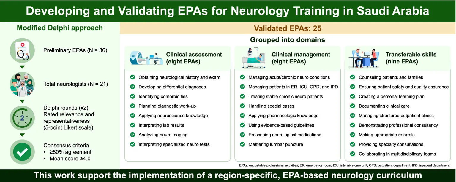 Alkhotani AM, Tawakul A, Alharbi LA, Alotaibi ME, Samannodi MS, Alim HM, Khadawardi HA, Almalki F, Imam AA, Dairi MS, Turkistani YA, Bulkhi AA, Zaini R and Almoallim HM (2025) Developing and validating entrustable professional activities for neurology residency training programs in Saudi Arabia: a modified Delphi study. Front. Neurol. 16:1688620. doi: 10.3389/fneur.2025.1688620