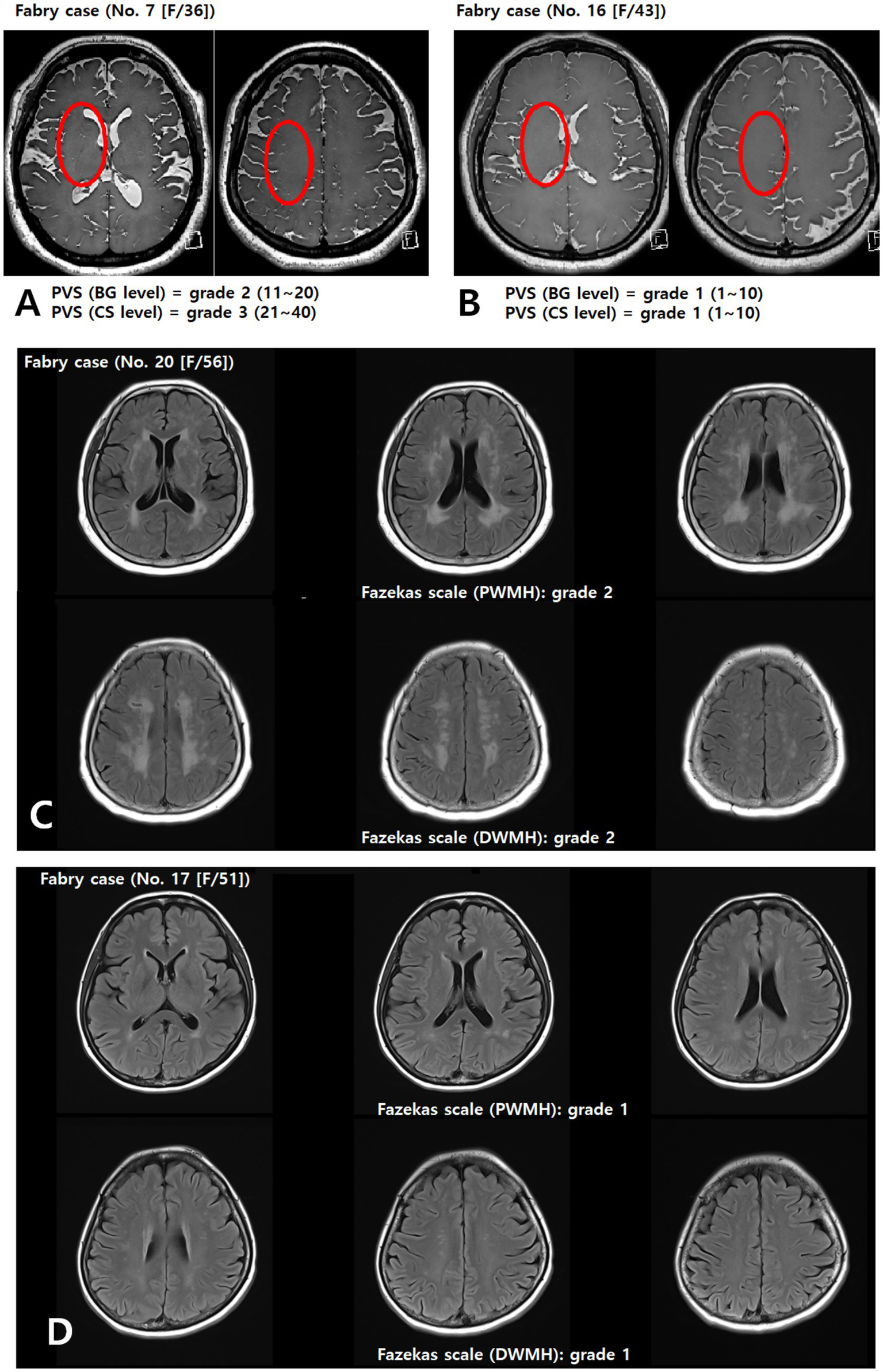 Figure 2. Assessment of the PVS (A,B) and Fazekas (C,D) scales. Representative axial T2-weighted image of a patient with FD showing multiple enlarged perivascular spaces (red circle) in the basal ganglia and centrum semiovale (A). BG, basal ganglia; CS, centrum semiovale; DWMH, deep white matter hyperintensity; PVS, perivascular space; PWMH, periventricular hyperintensity.