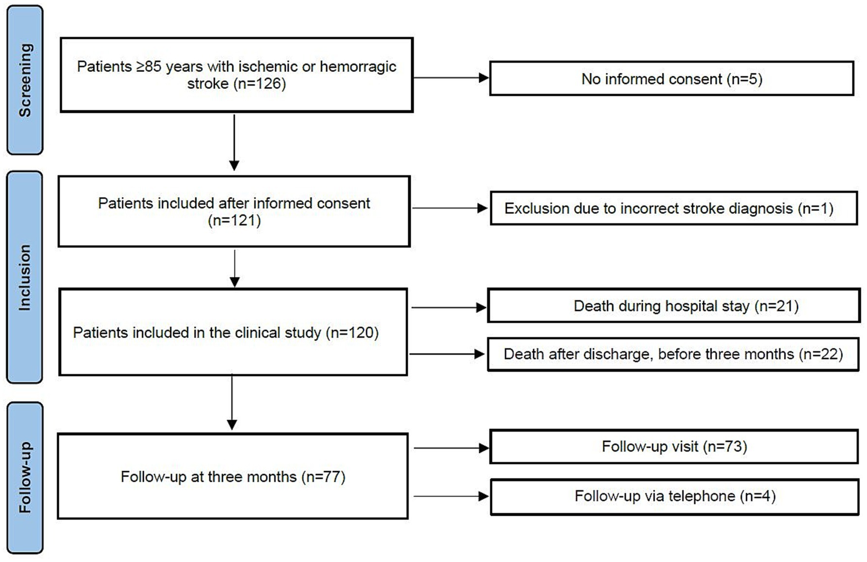 This cohort study consecutively included people aged 85 years and older with acute ischemic or hemorrhagic stroke who received standard stroke treatment (19) in the stroke unit at Karlstad Central Hospital, Sweden from April 2021 to June 2024. The unit is a primary stroke center serving a population of nearly 200,000 and has 20 beds, and acute stroke management is combined with multidisciplinary rehabilitation, such as early supported discharge. Approximately 500 patients/year are processed as “Code stroke alerts,” intravenous thrombolysis is administered either directly in the radiology department or in the stroke unit, and patients eligible for thrombectomy are transferred to Örebro University Hospital, located 110 km away. The assessments in the present study were conducted 2–7 days after admission and within 7 days of stroke onset. However, some patients with severe, fatal strokes were included later after obtaining consent from their relatives. A follow-up visit took place after 3 months.