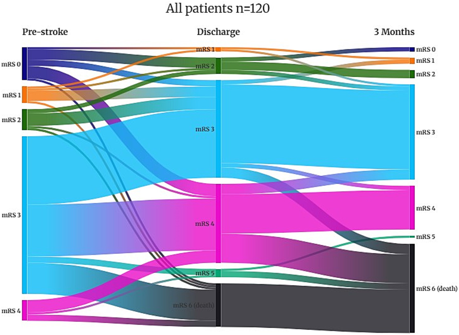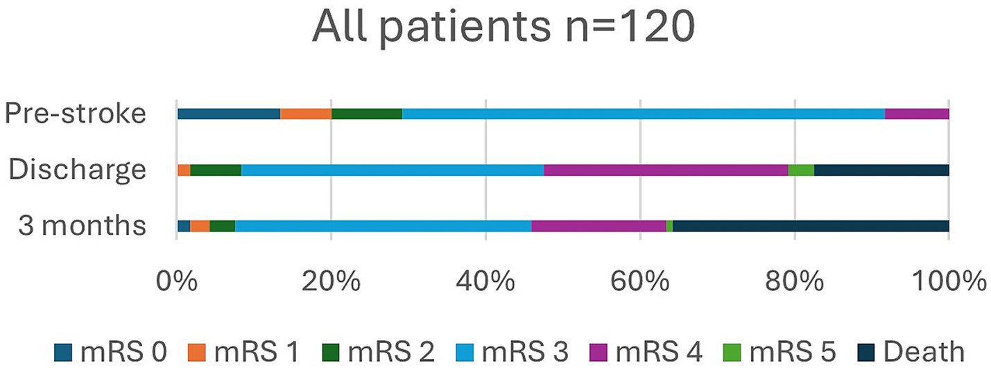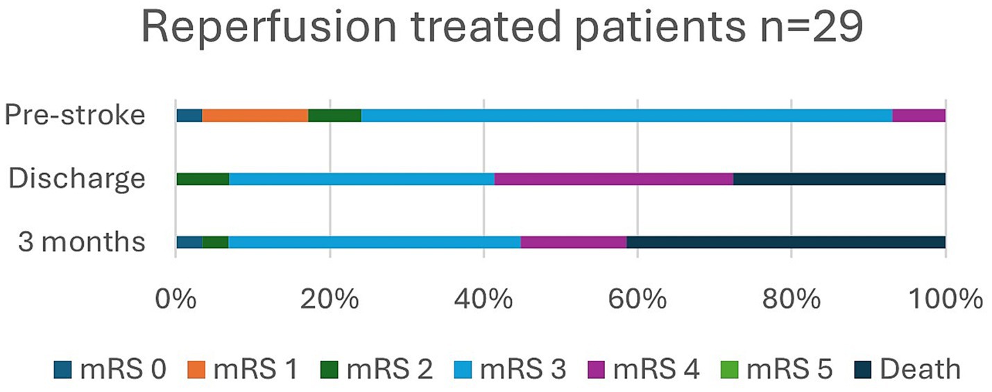 Figure 3. Modified Rankin Scale (mRS), pre-stroke, at discharge, and at 3 months in reperfusion treated patients.