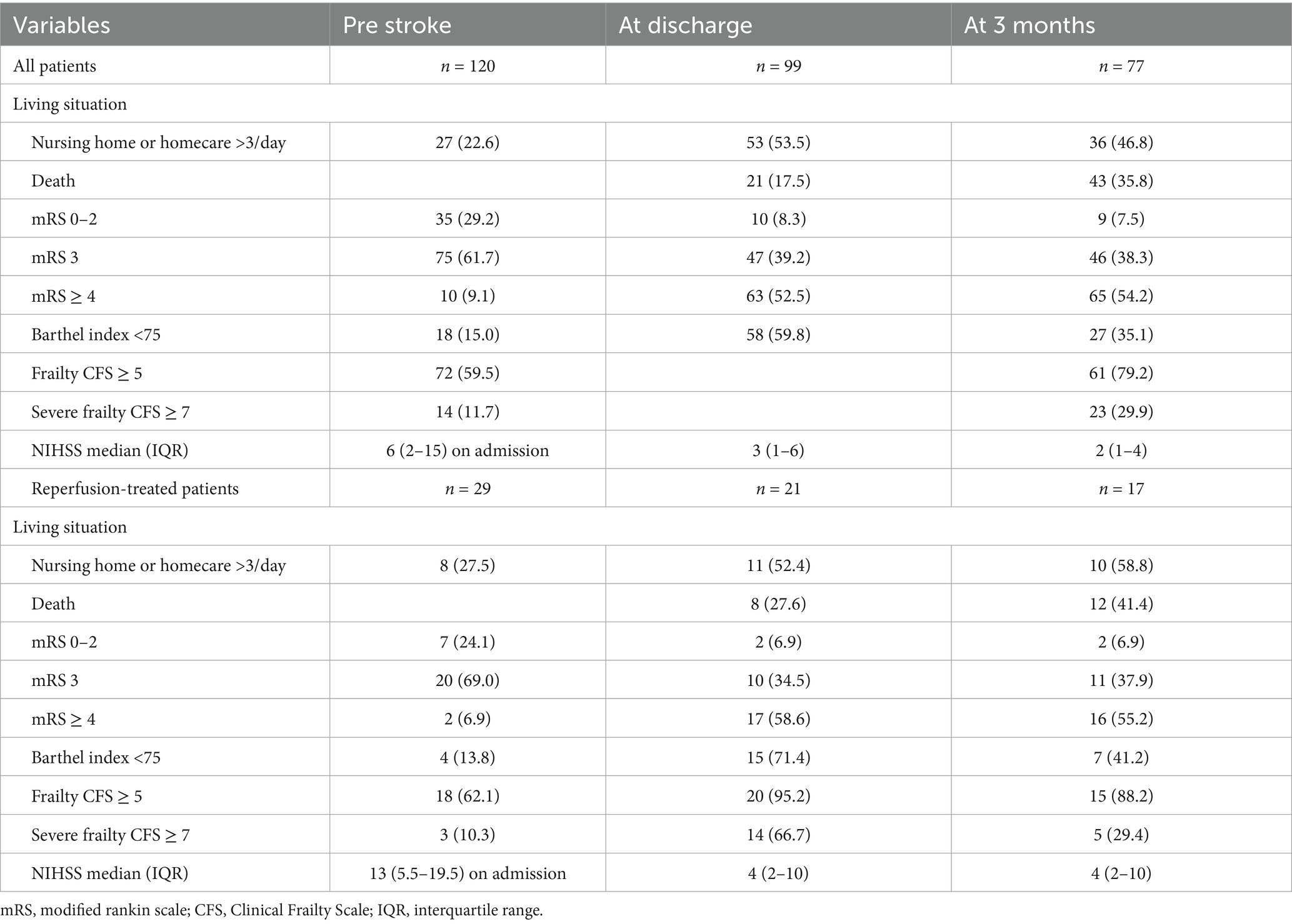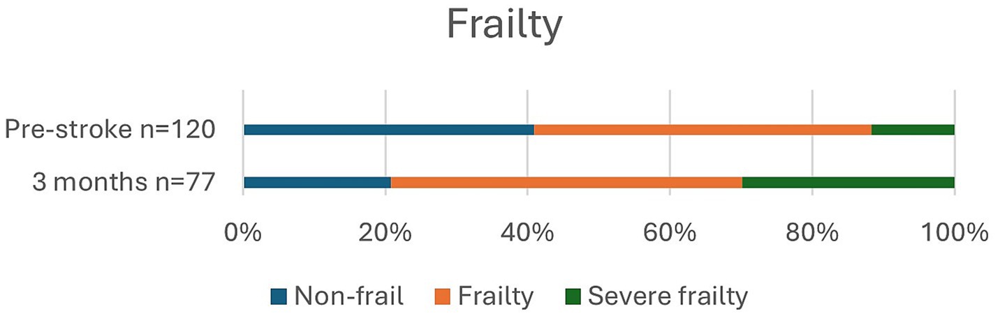 Prior to stroke, 22.6% of the patients lived in a nursing home or received home care more than three times daily, and it had increased to 46.8% at 3 months. Independence (mRS 0–2) was observed in 29.2% of patients pre-stroke and in only 7.5% of patients at 3 months post-stroke. Pre-stroke, 90.9% of the patients had an mRS score of 0–3 since most patients received some degree of home care. At 3 months, an mRS score of 0–3, which indicates a good outcome, was achieved in 45.8% of the patients. Overall, in 32.5% of patients, mRS was unchanged at 3 months compared to prior to stroke. Frailty, with CFS ≥ 5, was observed in 59.5% of patients pre-stroke and in 79.2% at 3 months, and severe frailty, with CFS ≥ 7, was observed in 11.7% of patients before stroke and in 29.9% at follow-up.