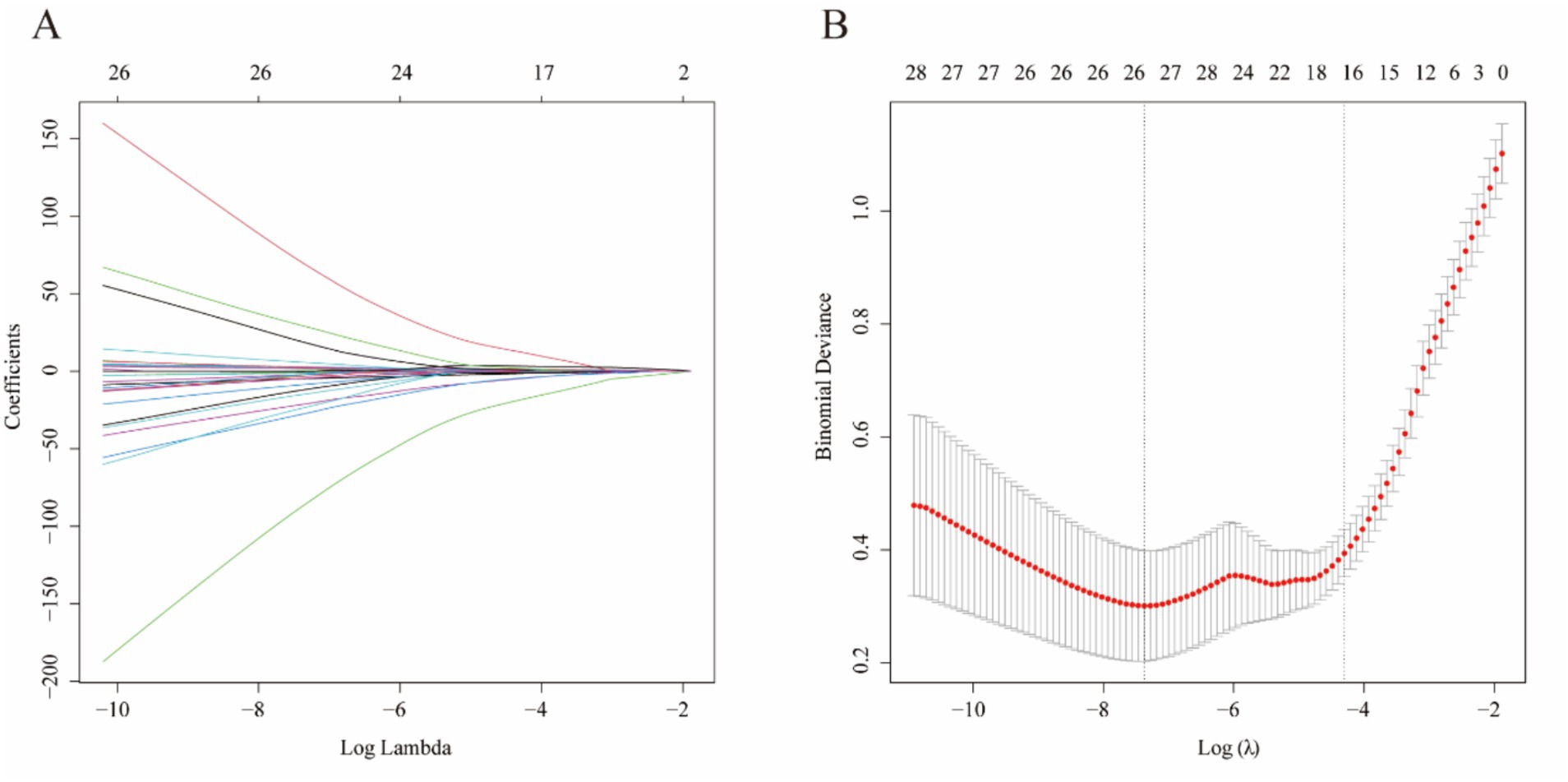 Figure 1. Lasso regression-based variable selection. (A) The trajectory of each variable coefficient as a function of log(λ). Each colored line represents the coefficient path of a variable during LASSO regularization. (B) The optimal value of the regularization parameter λ was determined by 10-fold cross-validation, where the red dots represent the mean binomial deviance and the error bars indicate standard deviations. The vertical dotted lines correspond to the λ values with minimum deviance and one standard error from the minimum, respectively.