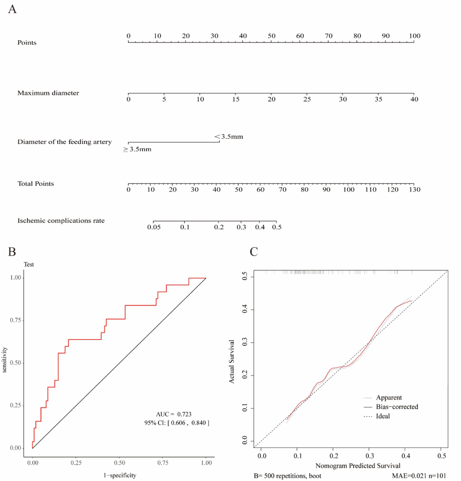 Figure 2. Construction and validation of the nomogram for predicting thromboembolic events (TEEs) after flow diverter treatment in patients with intracranial aneurysms. (A) Nomogram developed to estimate the probability of thromboembolic events based on independent predictors identified by LASSO logistic regression. (B) Receiver operating characteristic (ROC) curve of the nomogram, showing an area under the curve (AUC) of 0.723 (95% CI: 0.606–0.840), indicating acceptable discriminative performance. (C) Calibration curve of the nomogram generated by bootstrap resampling, demonstrating good agreement between predicted and observed probabilities.