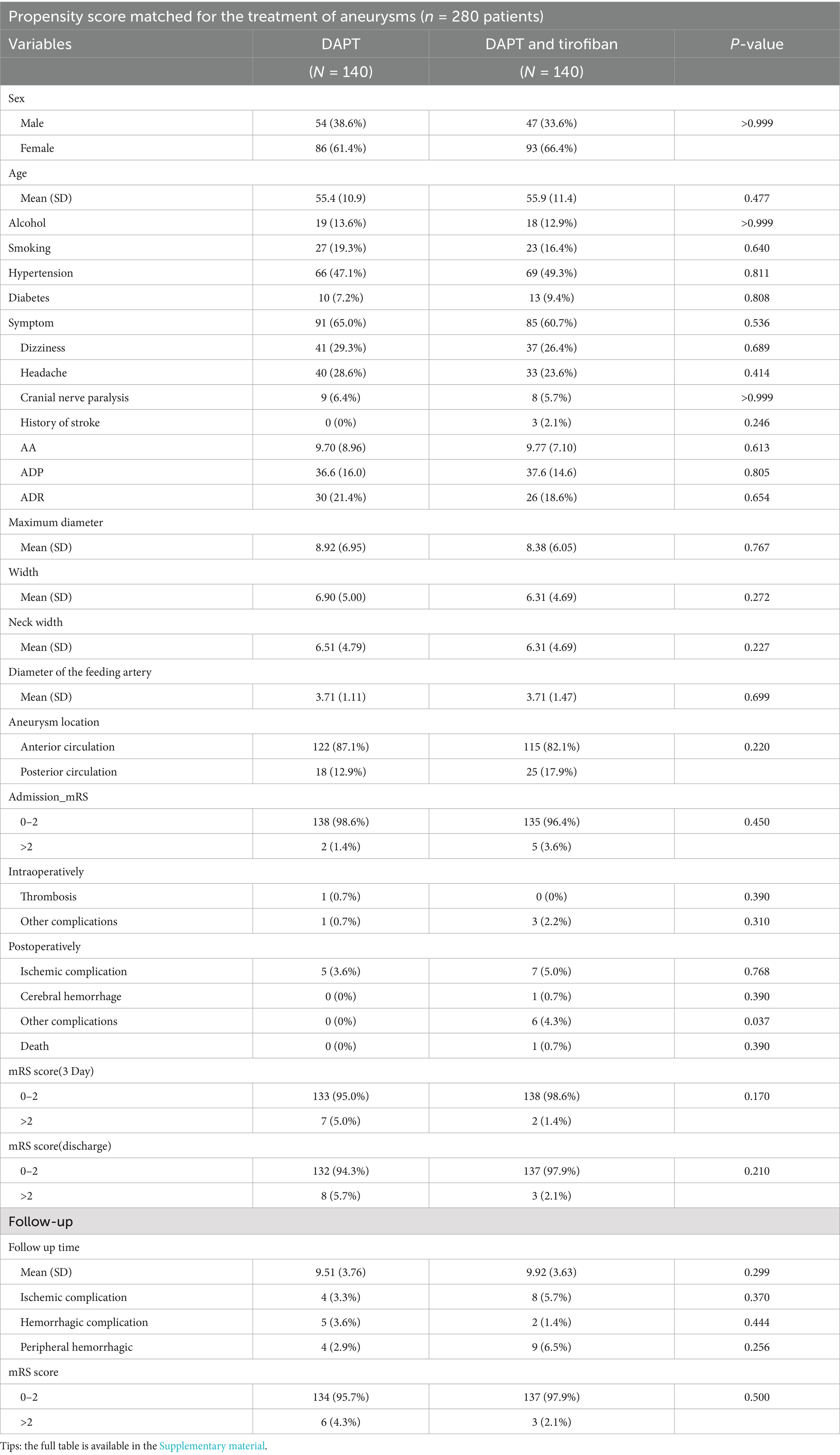 A total of 319 patients with unruptured intracranial aneurysms who underwent FDs treatment were included in this study. All patients received treatment with aspirin and clopidogrel, and 169 patients were additionally treated with tirofiban postoperatively. PSM was performed in this study, resulting in 140 matched pairs of patients. Table 1 demonstrates the comparability of baseline characteristics between the two groups after PSM matching. Supplementary Table S1 shows the baseline characteristics of the two groups.