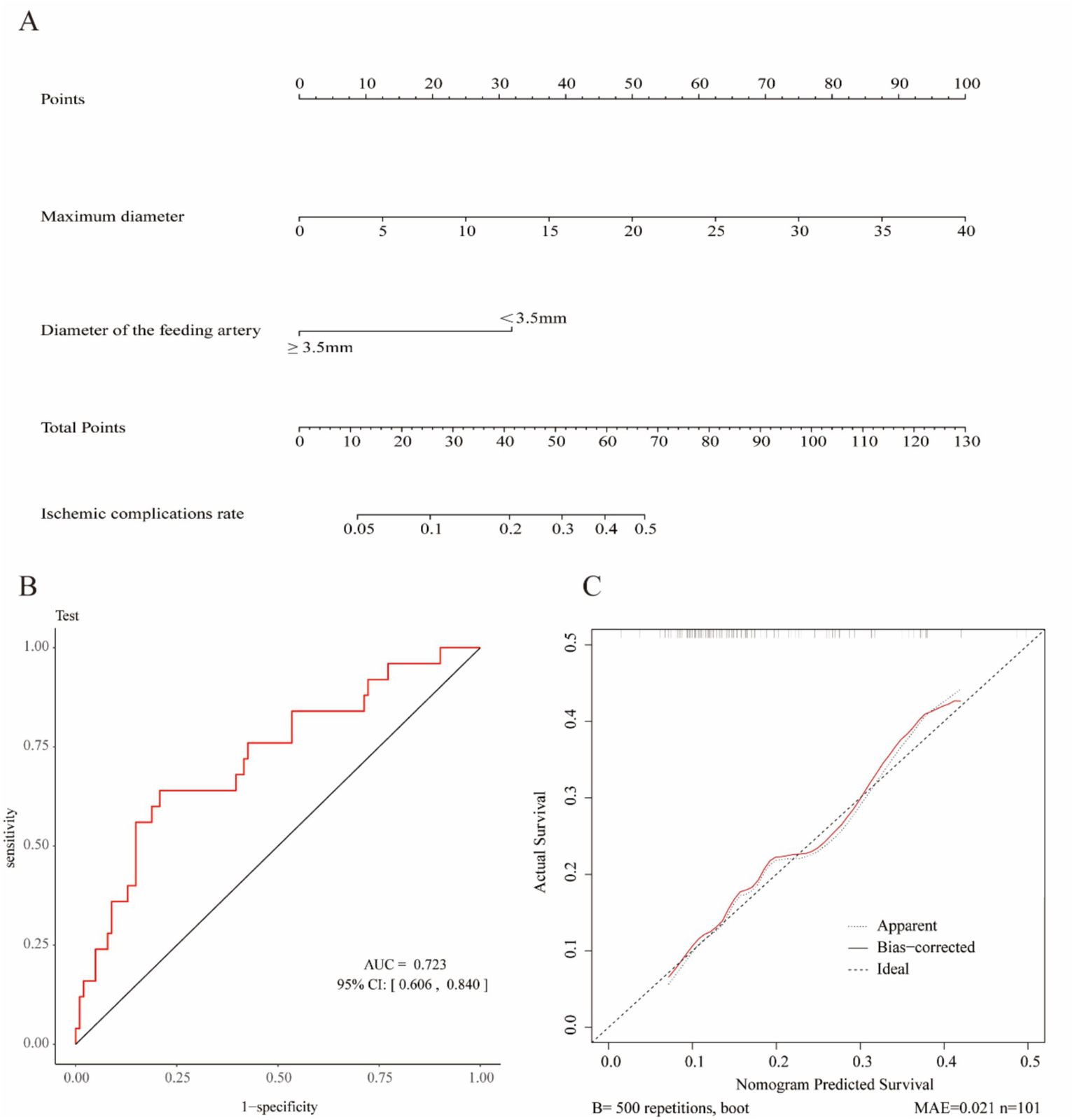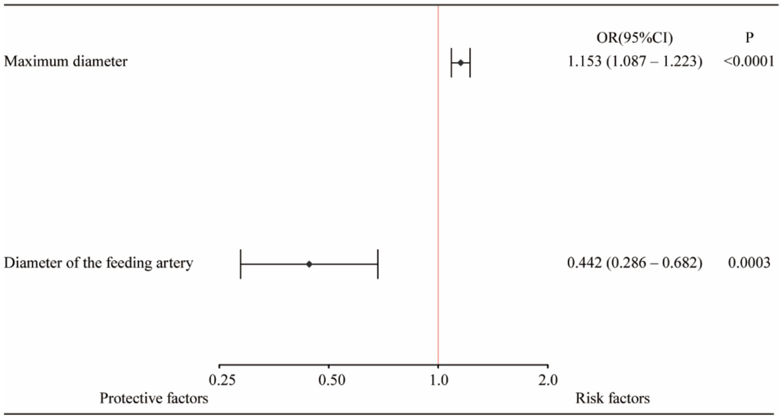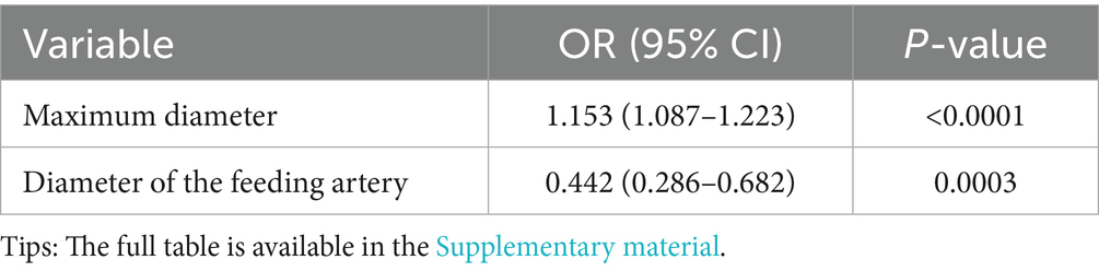 Lasso regression was used to select variables from the dataset, with the coefficient variation characteristics of these variables shown in Figure 1A. A 20-fold cross-validation was performed for iterative analysis, as shown in Figure 1B. The final variables retained included the maximum aneurysm diameter and the diameter of the feeding artery. Based on the parameters selected by Lasso regression, a logistic regression model was further developed (Table 2), yielding an area under the ROC curve (AUC) of 0.723 (95% CI: 0.606–0.840).