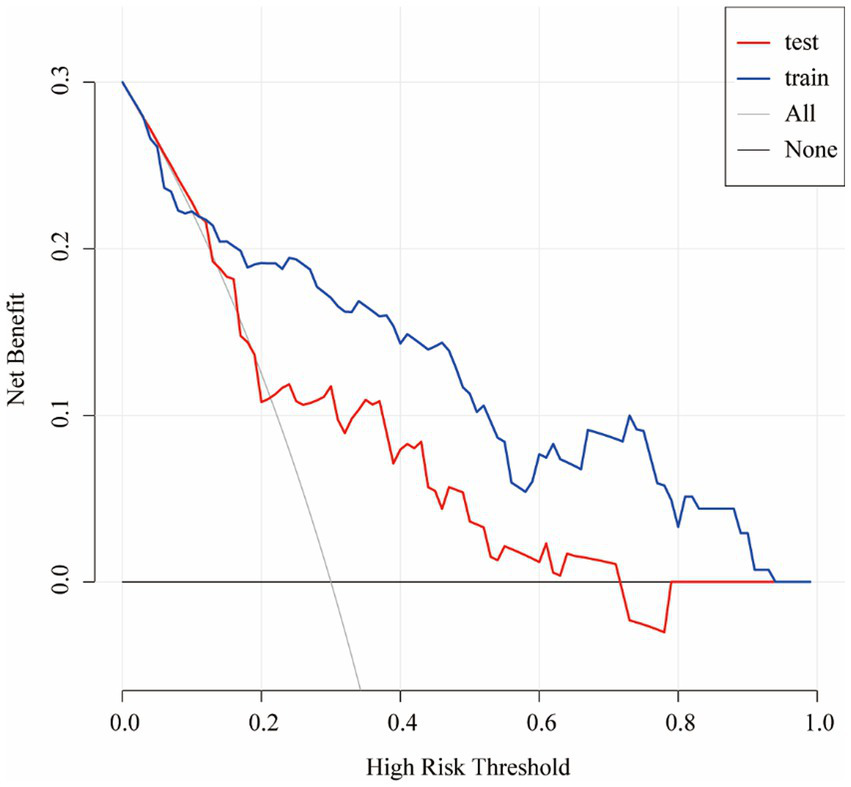 Furthermore, in this study, the dataset was randomly divided into training and test sets in a 6:4 ratio. Least absolute shrinkage and selection operator (Lasso) regression was employed to identify potential risk factors, and a predictive model was subsequently developed using logistic regression, incorporating the variables selected by Lasso. Odds ratios (OR) and their corresponding 95% confidence intervals (CI) were calculated through logistic regression analysis. The optimal λ value was determined via cross-validation, and the model’s predictive performance was evaluated using the concordance index (C-index) and receiver operating characteristic (ROC) curves. Model discrimination and calibration were further assessed using calibration plots. In addition, decision curve analysis (DCA) was conducted to evaluate the clinical utility of the model. Finally, the results were visualized in the form of a nomogram to facilitate clinical interpretation.