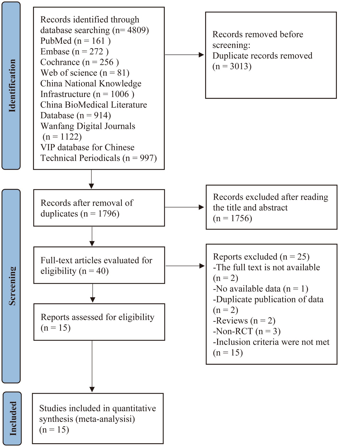 The initial literature search yielded 4,809 records. After removing 3,013 duplicates, 1,796 articles underwent title and abstract screening, which led to the exclusion of 1,756 records that did not meet the inclusion criteria. The remaining 40 articles underwent full-text review for eligibility assessment. Of these, 25 studies were excluded with reasons documented in Figure 1. Ultimately, 15 studies (19–33) qualified for inclusion in the systematic review and meta-analysis. The study selection process is detailed in the PRISMA flow diagram (Figure 1).